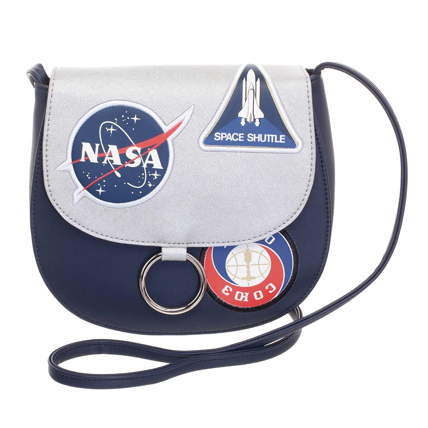 From Bioworld. Celebrate your love of all things space with this stylish saddlebag, complete with patches for NASA, the Space Shuttle, and the International Space Station.
