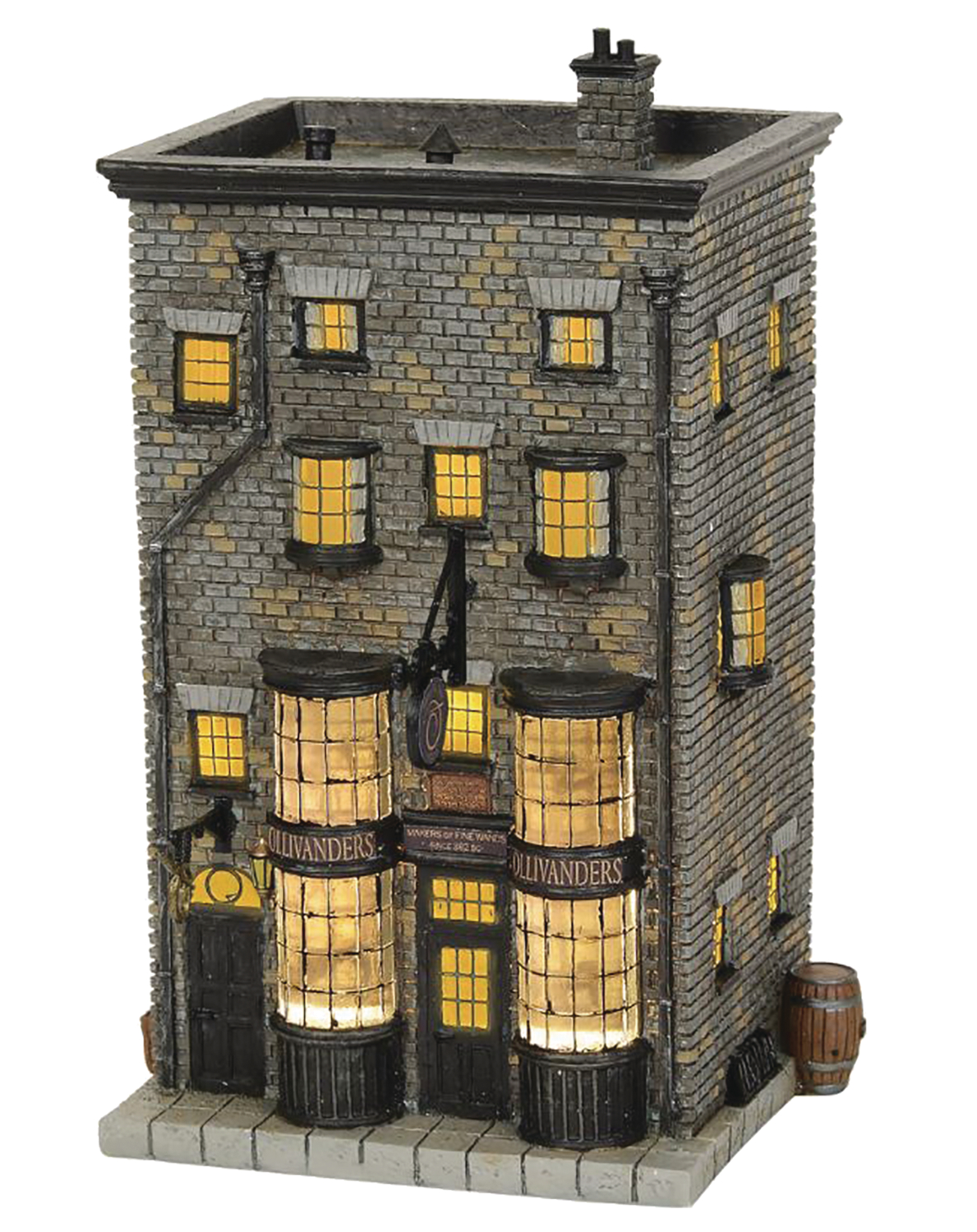 Located in Diagon Alley, Ollivanders was founded in 382, BC. It is the place where every young wizard receives his or her wand. Do you choose the wand, or does the wand choose you? Special details include the iconic curved glass bay windows.