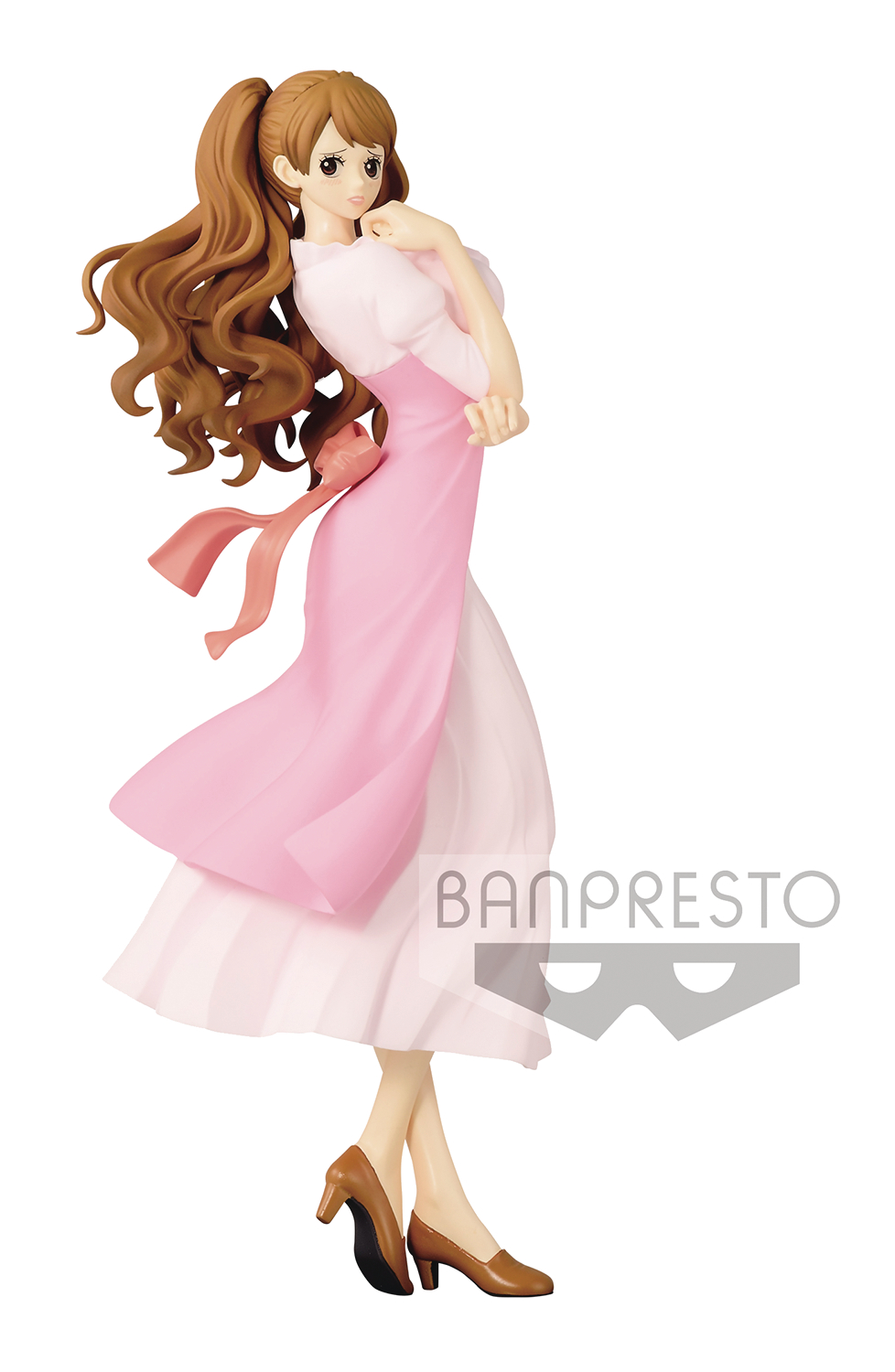 One Piece! She stands at a height of about 9 1/2" tall and is depicted looking over her shoulder with a shy pose. Choose from Pink or Red dresses.