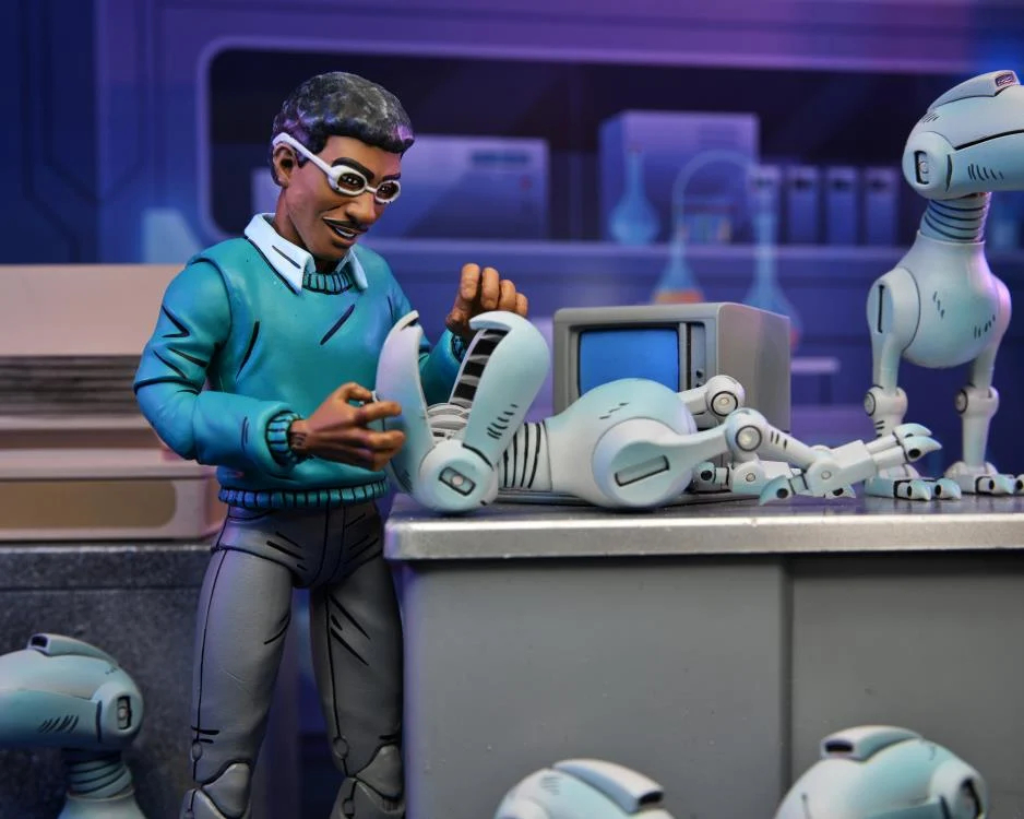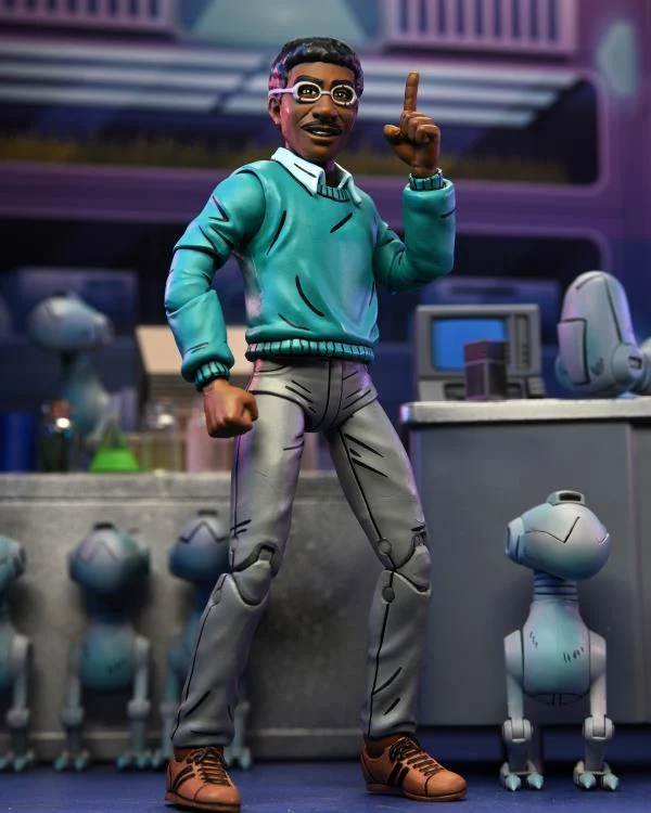 Baxter Stockman: evil genius or precocious programmer gone mad in pursuit of a petty pipe dream? This 7" scale action figure features comic accurate deco and comes with all new mouser, computer, miniature building, plus extra hands, and heads for perilous plug-and-play plundering. Window box packaging featuring new artwork by