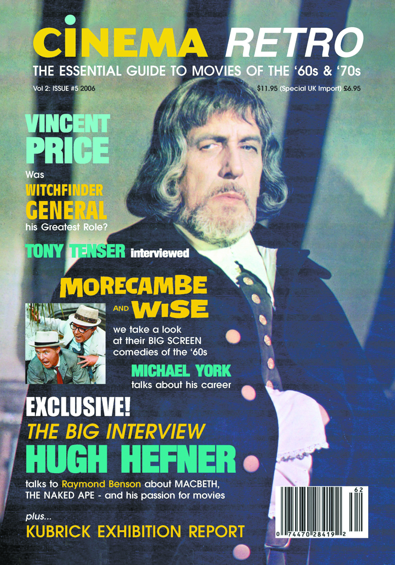 Witchfinder General Vincent Price's greatest role? Find out in this photo-filled 8-page tribute to this classic British film directed by the late Michael Reeves. Also, this issue features an exclusive interviews with Hugh Hefner, who discusses his many