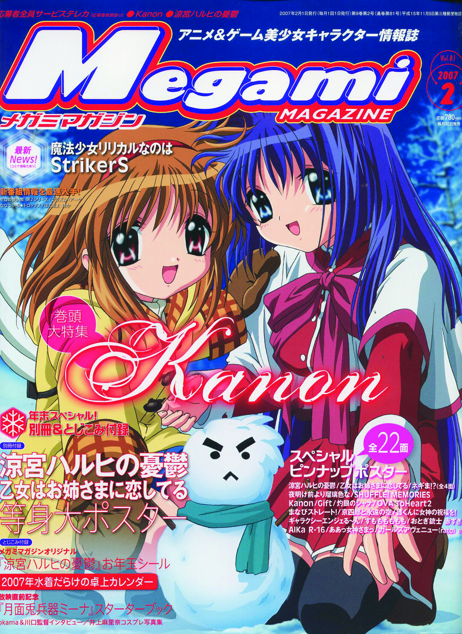 Megami is the best Japanese anime magazine for tons of free giveaways, as well as full-color artwork and posters! Includes telephone cards, punch-out "character stands," stickers, and much more! Japanese text.