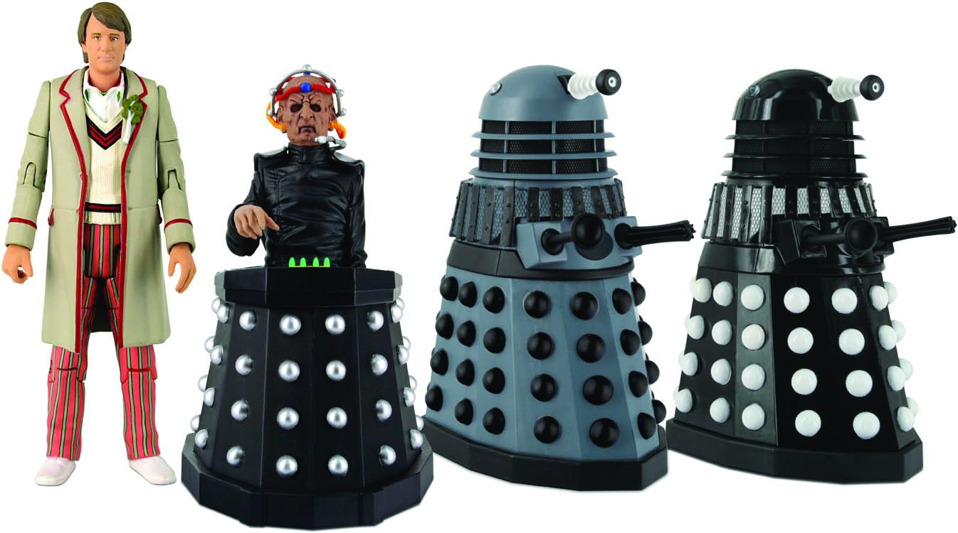 Doctor Who storyline "Resurrection of the Daleks," comes with the fifth Doctor, Davros, the Dalek Supreme (black), and a Dalek (gray).