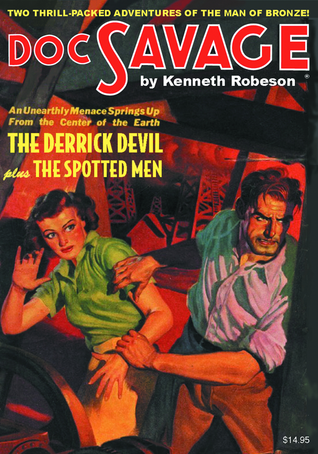 The pulp era's greatest superman returns in classic pulp thrillers by Lester Dent and William Bogart. First, the Man of Bronze is summoned to the Oklahoma oil fields to confront the horrific rampage of "The Derrick Devil." Then, Doc and his aides journey to Lake Erie where a mysterious malady is turning steel workers into "The Spotted Men."