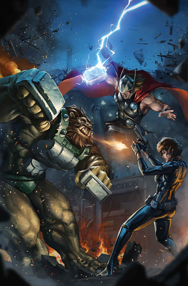 • Thor and SHIELD agent Roz Solomon vs. Ulik the troll! ROXXON vs. Broxton, Oklahoma! And in the far future, the Goddesses of Thunder take on Old Galactus! But wait, where's King Thor...?