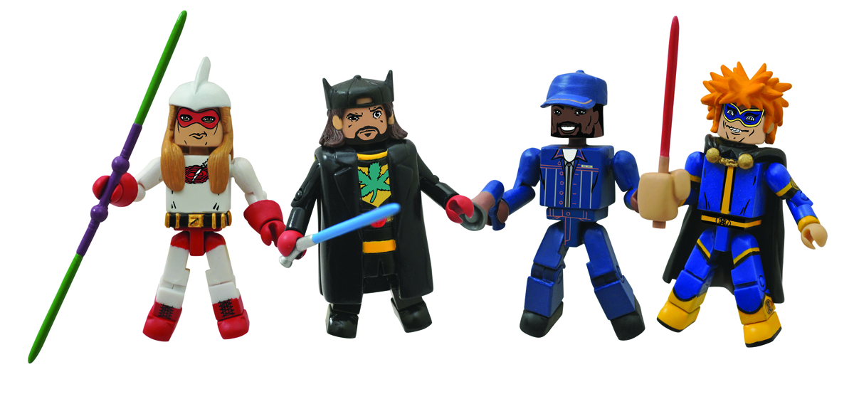 A Diamond Select Toys Release! Snootchie bootchies! This new four-pack of Minimates features four all-new mini-figures based on Kevin Smith's classic road movie Jay and Silent Bob Strike Back. Jay & Silent Bob star as Bluntman & Chronic, and they share the stage with director Chaka Luther King and the dastardly Cock-Knocker! Each Minimate stands 2 inches tall and features a variety of interchangeable parts and accessories. Designed and Sculpted by Art Asylum!