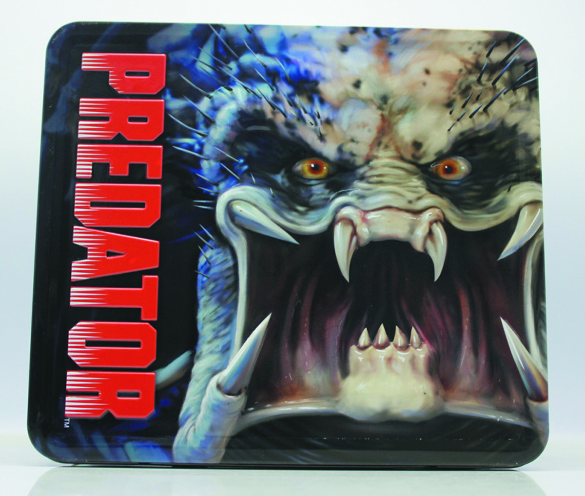 A Diamond Select Toys Release! The alien hunter from FOX's sci-fi action film Predator features on this new tin lunchbox, with one side showing his masked visage and the other depicting the Predator in its full alien monstrosity! Plus, it comes with a matching thermos with an image of the masked and unmasked Predator!