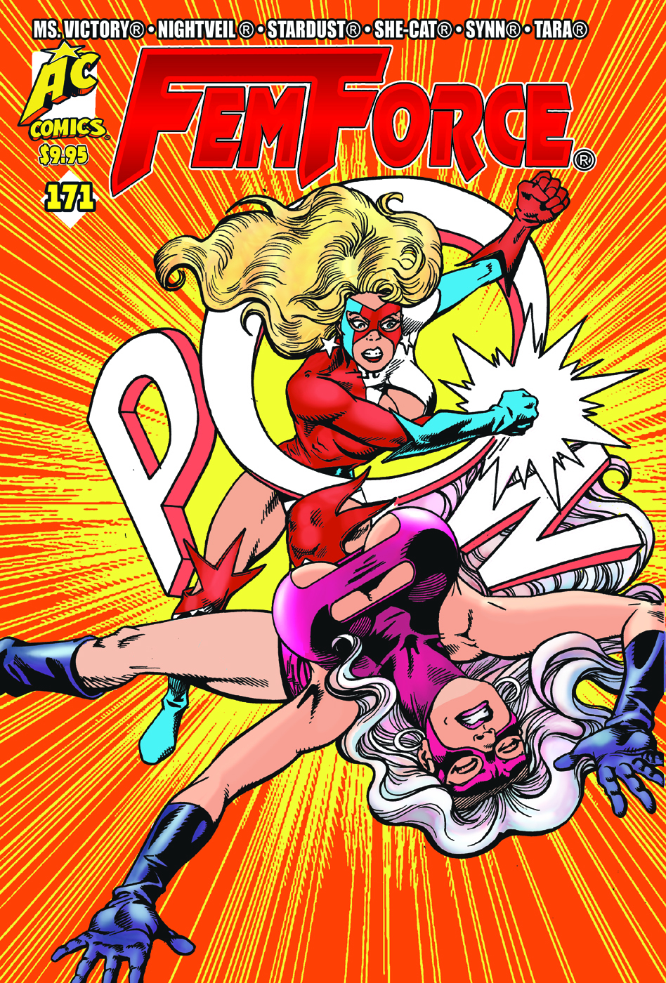 The Femforce battle Ms. Victory herself in "Evil At Center Stage!" She-Cat's personal life is complicated by Mike McCluskey (Scarlet Scorpion) written by Stephanie Heike, while Tara Fremont runs afoul of a disgruntled gold-digger in "Trophy Wife." Plus, Nightveil on Dark Dhagor; The Blue Bulleteer, and more!