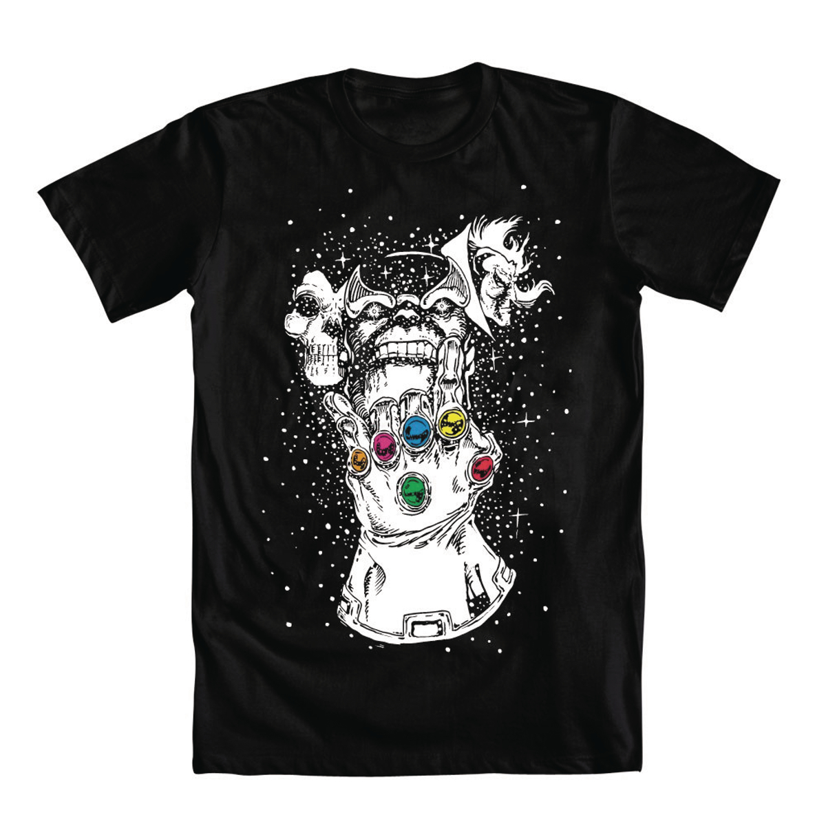 Thanos flashes a gang symbol with the Infinity Gauntlet on his fist with the artwork on this black t-shirt that riffs on George Perez's artwork for The Infinity Gauntlet!