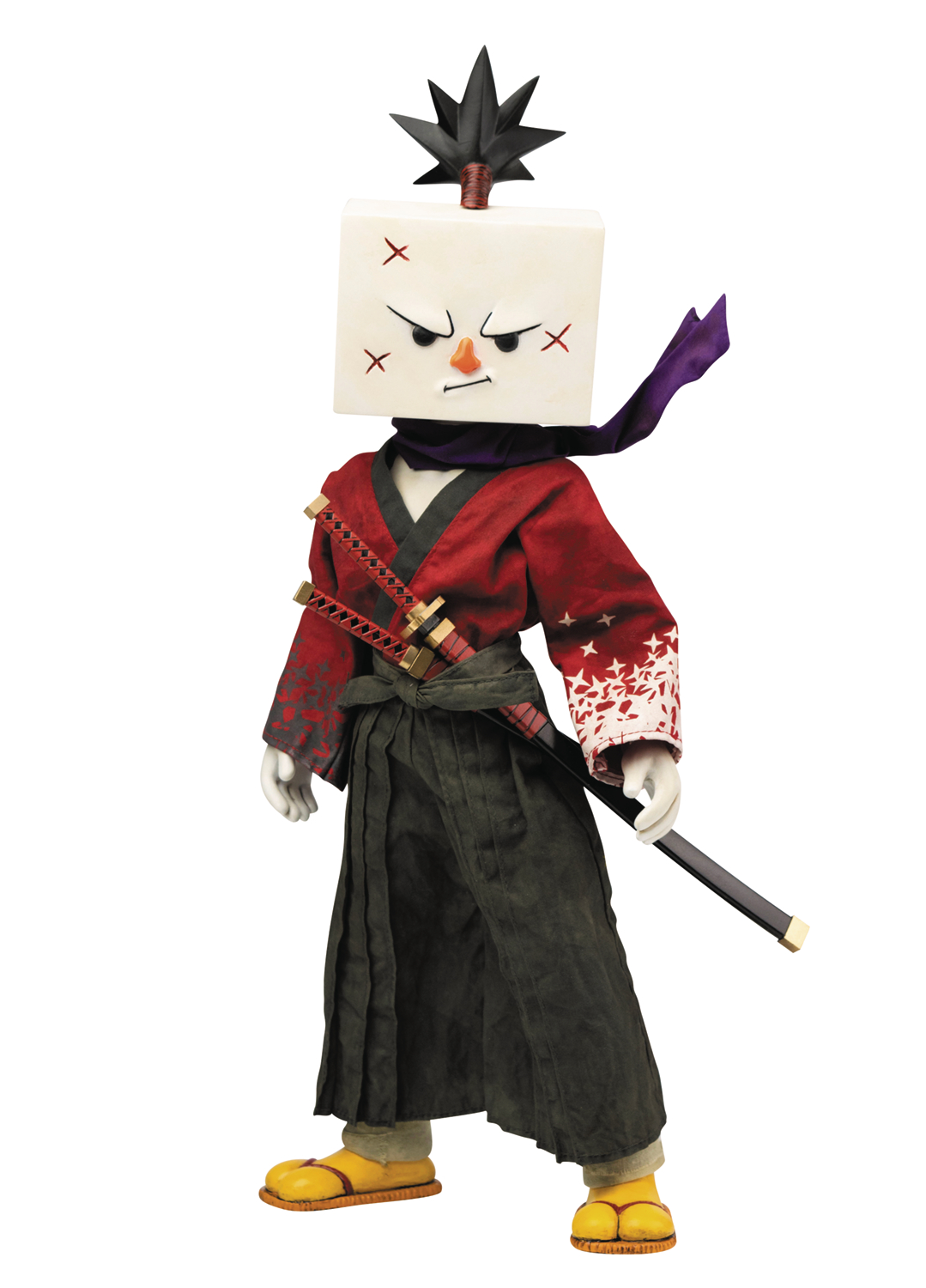 From ThreeA Trading Company. This impressive and whimsical 15" figure features 5 interchangeable hands (one for holding a gun, one pair for holding swords and one relaxed pair), a kimono, scarf. Bamboo hat, samurai sword, wakizashi and gun. Plus, his sidekick