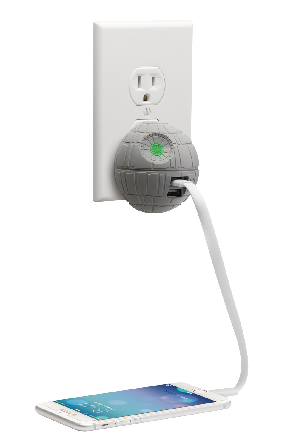 Star Wars Death Star USB Wall Charger. Measuring 2 3/4" across and extending 1 3/4" from the wall, it plugs into a grounded outlet and provides you 2 USB ports, one 2.1A and one 1.0A. Plus, it lights up when receiving power, so it's an easy tool to bring with you when you're testing breakers.