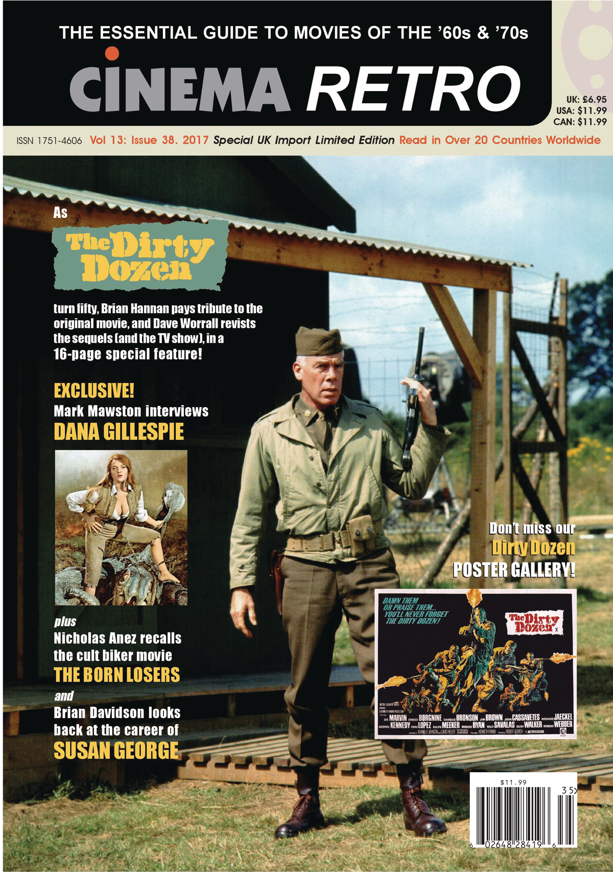 The Dirty Dozen with a special 18-page tribute, including the made-for-TV sequels and short-lived TV series. Mark Mawston interviews busty singer/Hammer actress Dana Gillespie, and Brian Davidson pays tribute to the lesser-known actor Victor Henry. Nicholas Anez recalls the cult biker movie