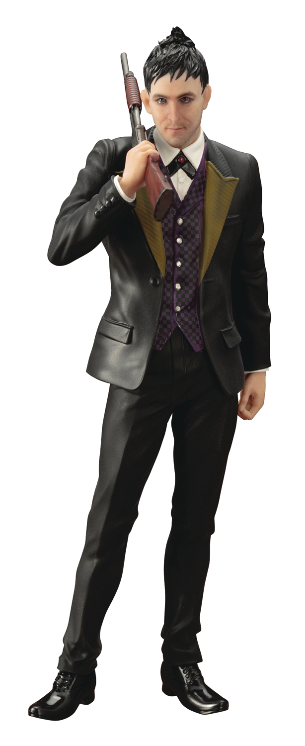 From Kotobukiya. Kotobukiya introduces statues from DC's Fox television show Gotham. The second character recreated in the fantastic 1/10-scale ARTFX+ format is everyone's favorite nefarious villain, Oswald Chesterfield "Penguin" Cobblepot! Ready to take down a rival mob boss or inflict permanent harm on someone who called him "Penguin," Oswald Cobblepot has never looked more dashing or dangerous. The Gotham City gangster stands in a relaxed pose, leaning over one leg with the other kicked out... and of course his feet are splayed outward representing the gait that contributed to his nickname. Penguin wears a fancy black suit with shiny shoes, a spiffy yellow inner lining in his jacket, purple checkered vest, white shirt, and black crossover tie with red gem. Actor Robin Lord Taylor's soulful yet determined expression is expertly recreated in miniature and this Cobblepot looks like he just stepped right off the screen. Oswald Chesterfield Cobblepot stands just over 7 inches tall (in the ARTFX+ 1/10th scale).