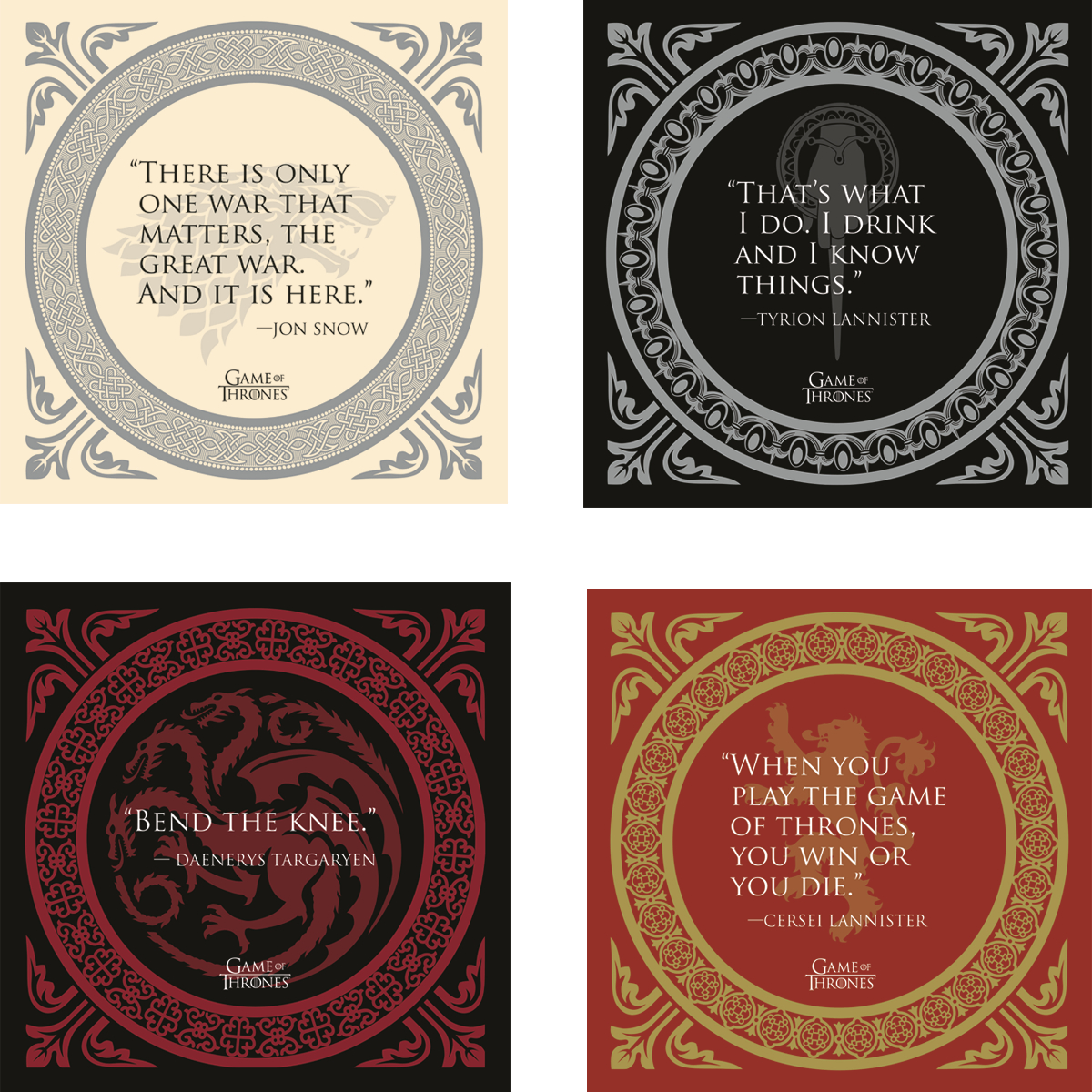 As the final season of HBO's award winning show Game of Thrones approaches, relive epic moments with these coasters featuring quotes from Daenerys Targaryen, Tyrion Lannister, Jon Snow, and Cersei Lannister. Each coaster comes adorned with a sigil and unique border, in full color packaging.