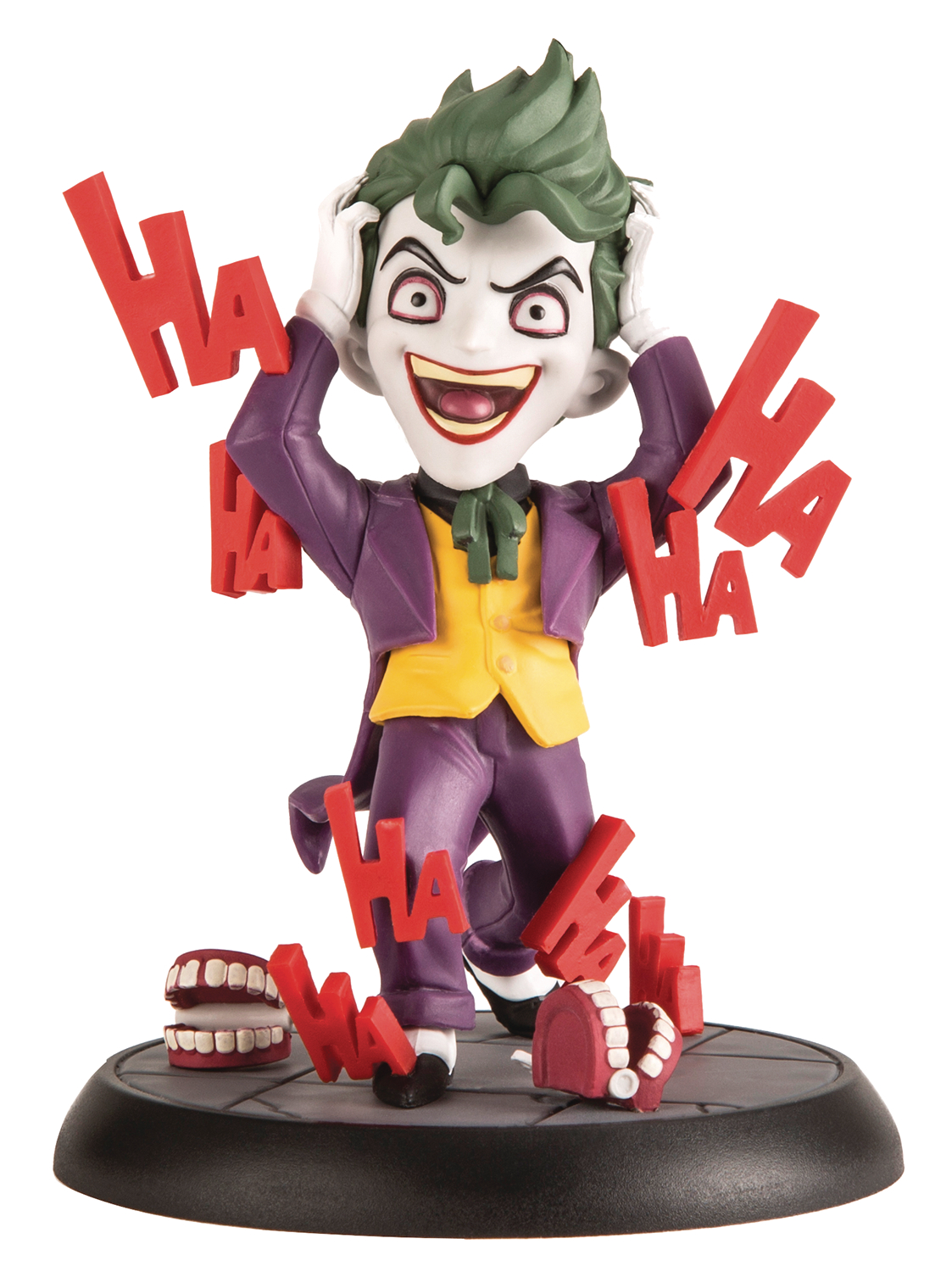 The Killing Joke by Alan Moore, this Q-Fig shows The Clown Prince of Crime in his traditional purple suit surrounded by his favorite toys, the chattering teeth. His manic laughter comes to life around him as his expression perfectly captures his trickster madness, hands on the sides of his head as if to hold the crazy in. The joker is made from PVC and stands about 4" tall.