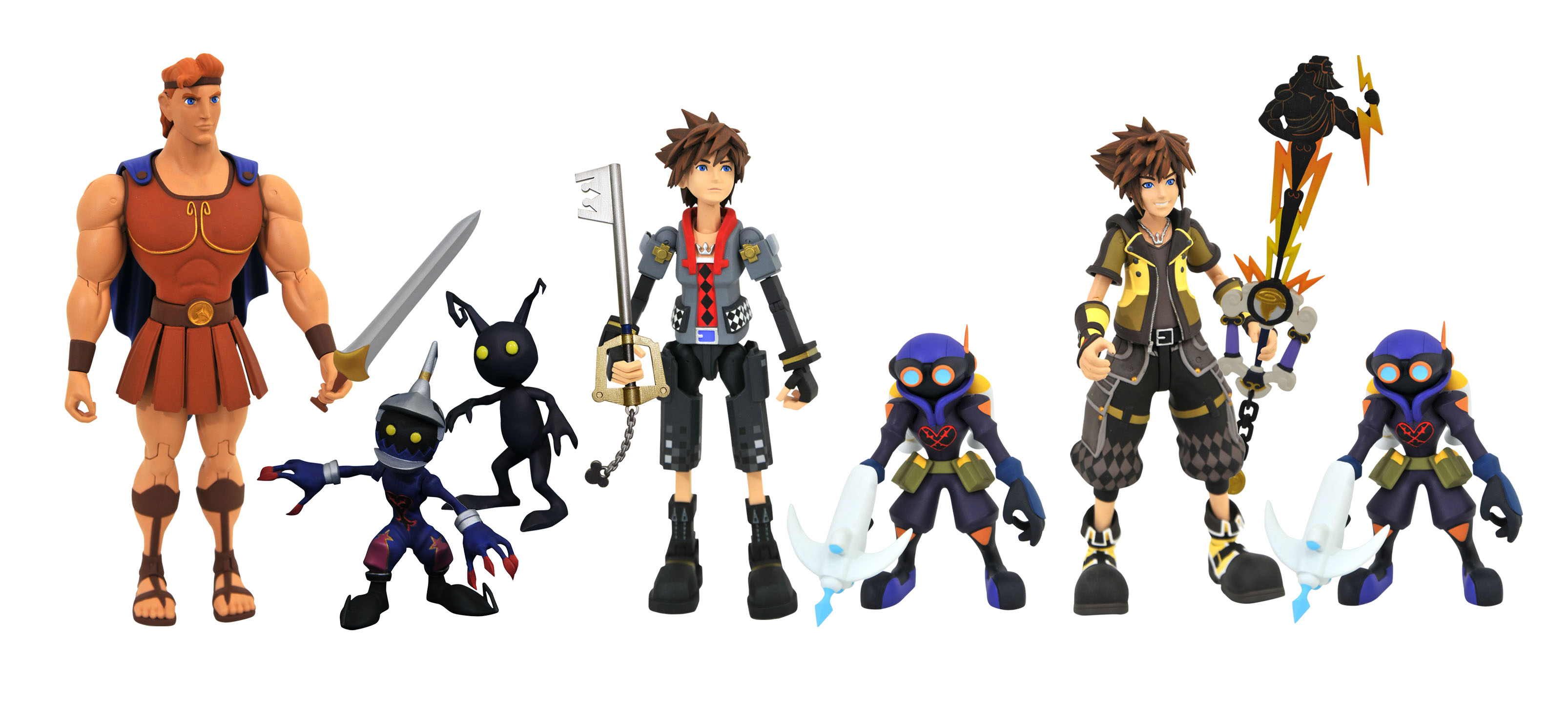 A Diamond Select Toys release! The new Kingdom Hearts game is final here, and DST has more figures to celebrate! Based on Kingdom Hearts 3, this assortment of three multi-packs includes Hercules with a Dusk, Toy Story Sora with an Air Soldier and the Favorite Deputy Keyblade, and Guardian form Sora with an Air Soldier and the Hero's Origin Keyblade! Each 7-inch scale action figure features a full range of articulation, and each set comes packaged in display-ready Select figure packaging. Sculpted by Oluf W. Hartvigsen!