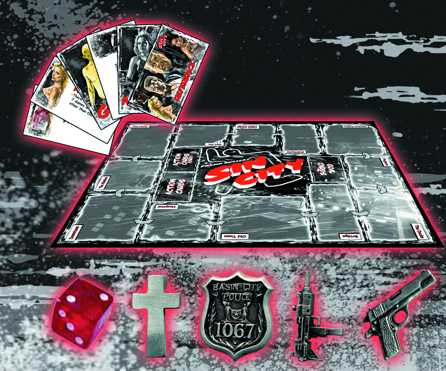Sometimes, winning a boardgame means killing a whole lot of people. Playing time is 30 to 60 minutes in Frank Miller's Sin City... a mean and nasty game of cops, creeps, and dames for 2-6 players, ages 18 and up. With a number of special game cards, four pewter game tokens, and a die, you'll have everything you need to bluff - or perhaps shoot - your way into a crime-fueled victory. Extortion, corruption, murder... it's all in a day's work for the people who run Frank Miller's
