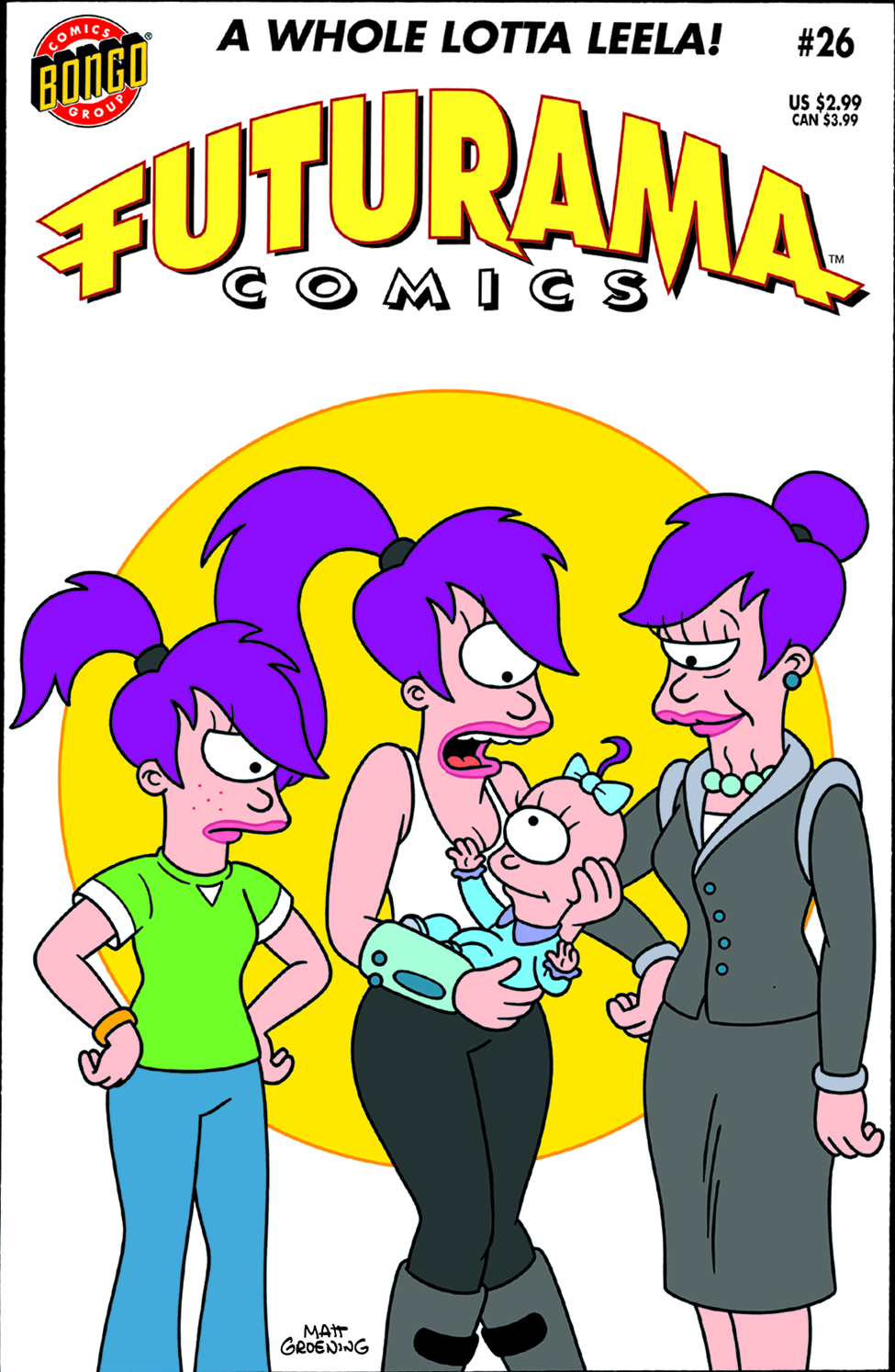 After a freak accident with Professor Farnsworth's Time Rifle, Leela is blown to past, present, and future bits, dividing her into her toddler, teen, and elderly selves. Any way you look at it, there's a whole lotta Leela going on.