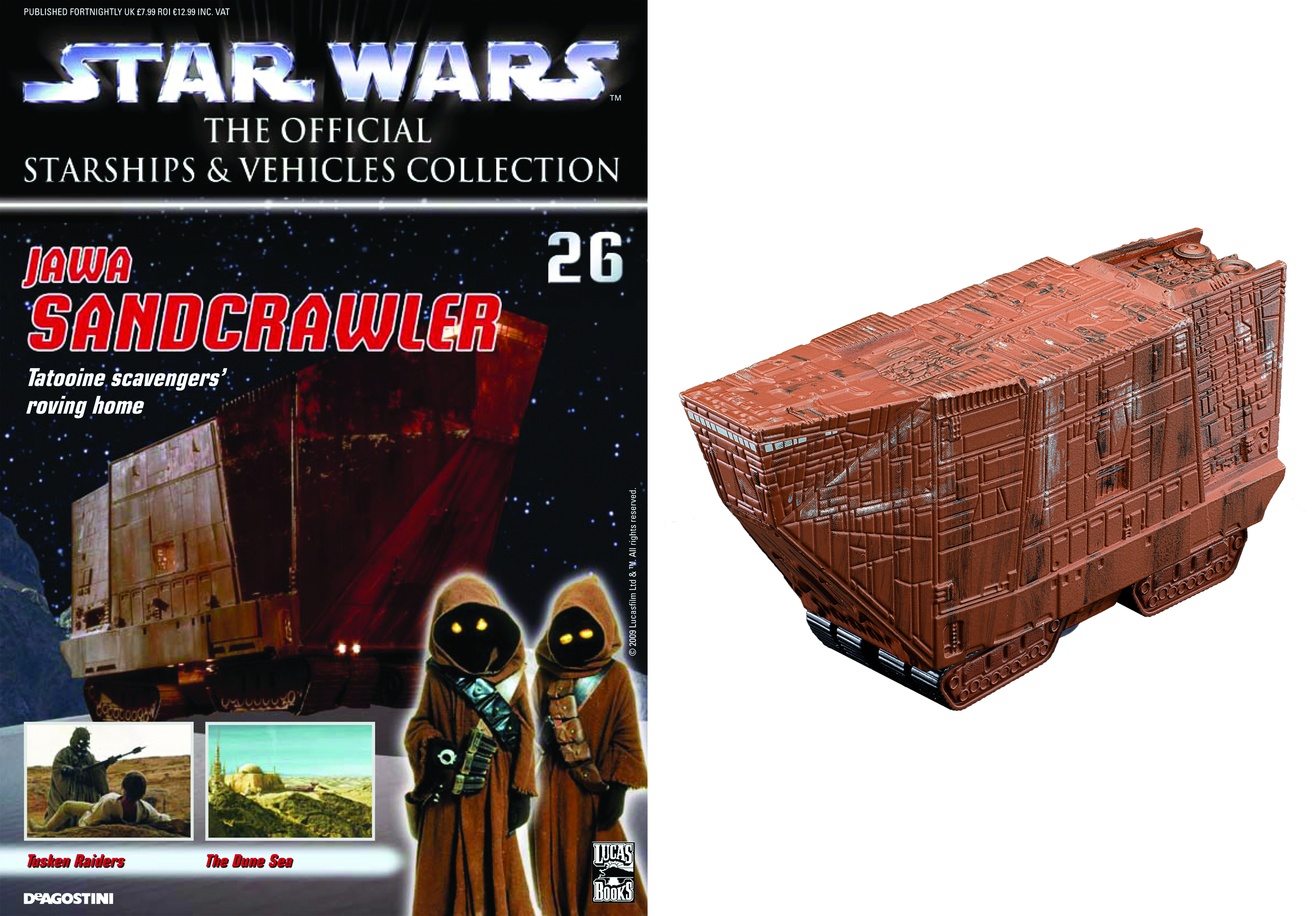 The Star Wars: The Official Starships and Vehicles Collection Magazine brings fans superbly detailed, painted metal models of the most amazing starships and land vehicles from George Lucas' mythic Star Wars films. Each comes with a copiously illustrated magazine that relates the history of the vehicle, its pilots or crew, and full technical specifications. Readers will also uncover information on the other fascinating craft from the Expanded Universe of the novels and comics, plus the inside story on the making of the films. Choose from the AT-TE Walker (#25), the Sandcrawler (#26), the Alliance Tank Droid (#51), and the T-16 Skyhopper (#52). This month, collectors can also fill in gaps in their collection with the Death Star II (#9), the Snowspeeder (#10), the ARC-170 Starfighter (#35), or the Naboo Queen Royal Starship (#36).