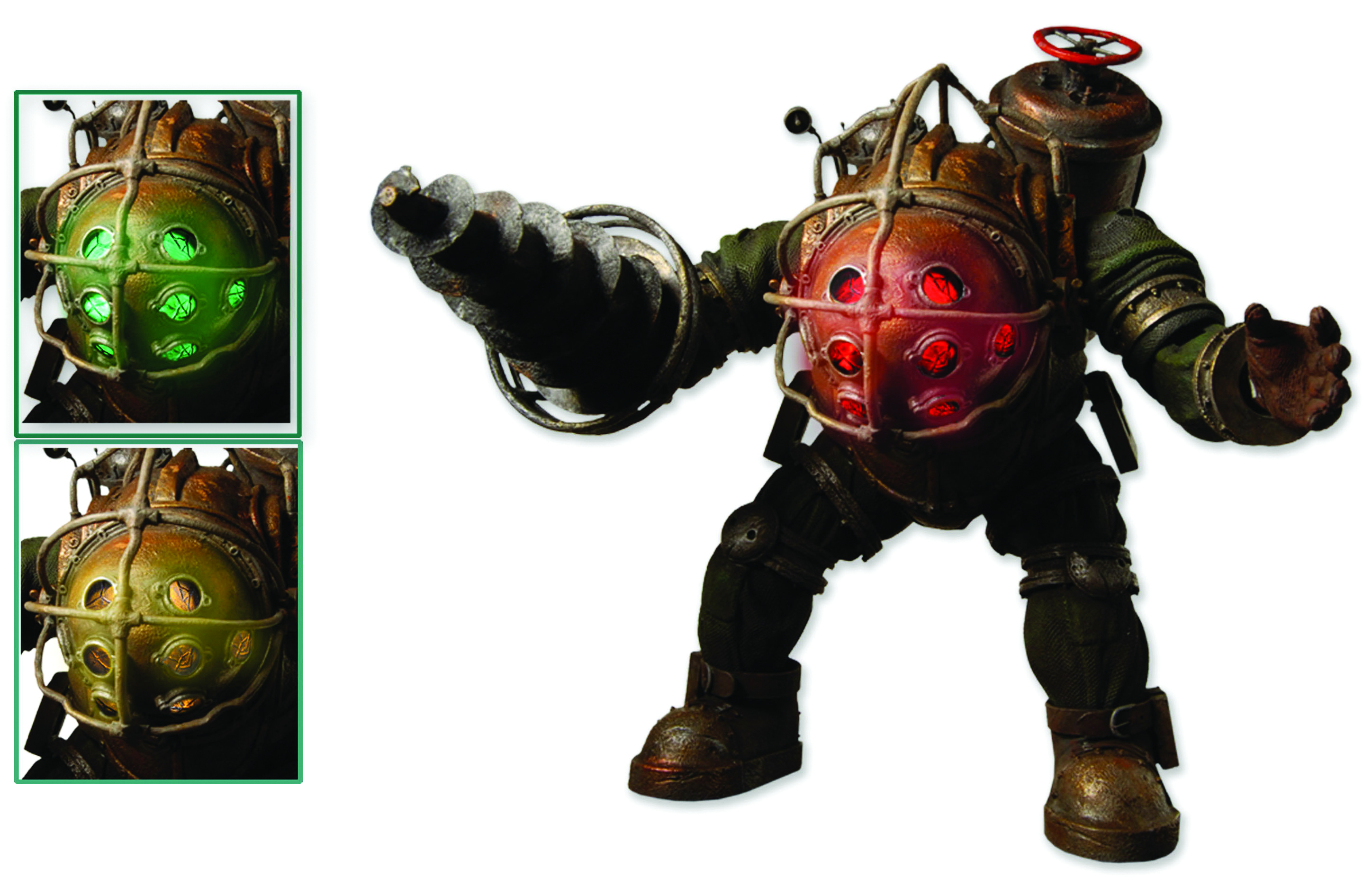 BioShock franchise gets an upgrade! The Big Daddy "Bouncer" is now electronic and features light-up eyeports on his head. A 3-way switch allows you to select Green, Yellow, or Red LED lights to represent his mood.