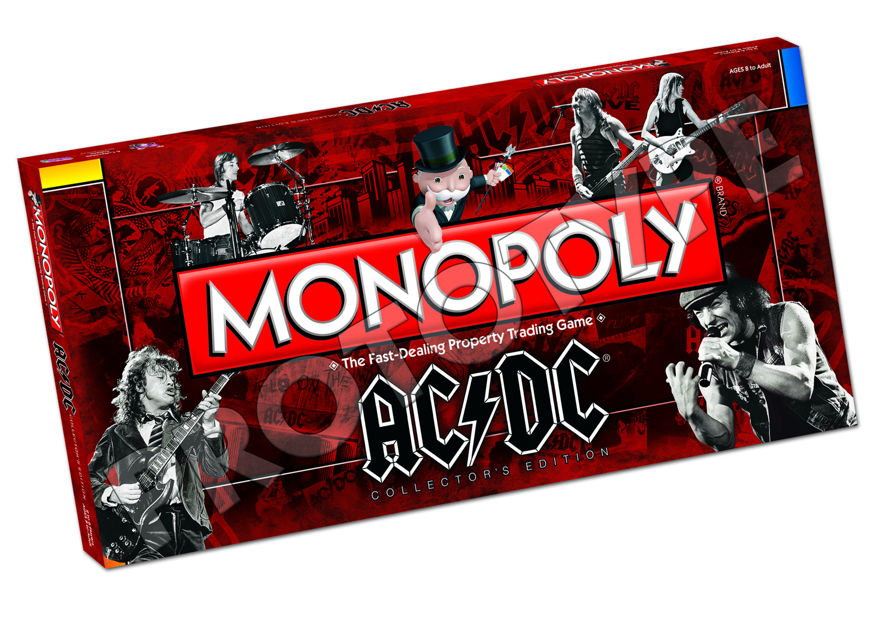 AC/DC Lane and more, allowing fans to build their own AC/DC empire. Includes 6 custom tokens: Cannon, Bundle of Dynamite, Bell on Fire, Lightning Bolt, Angus's School Boy Hat, and Stacks of Cash.