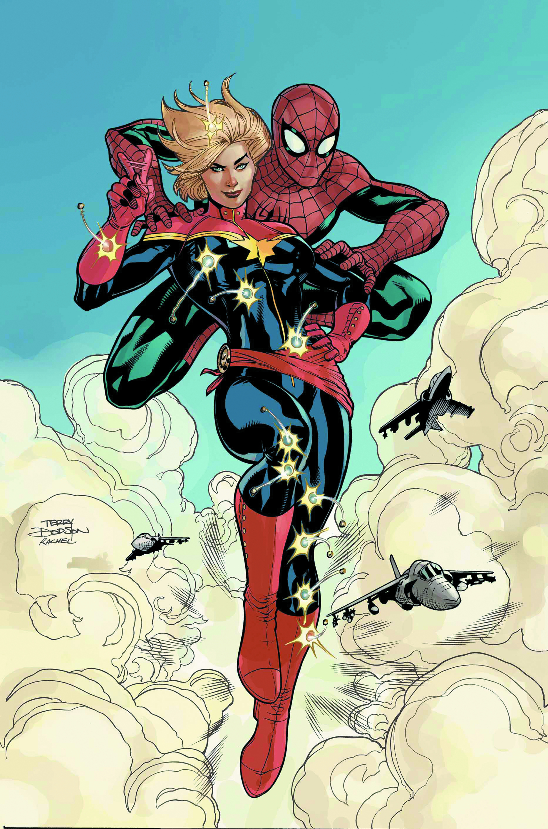 Spider-Man plummets into action with the star of this month's hottest new comic: the all new CAPTAIN MARVEL!