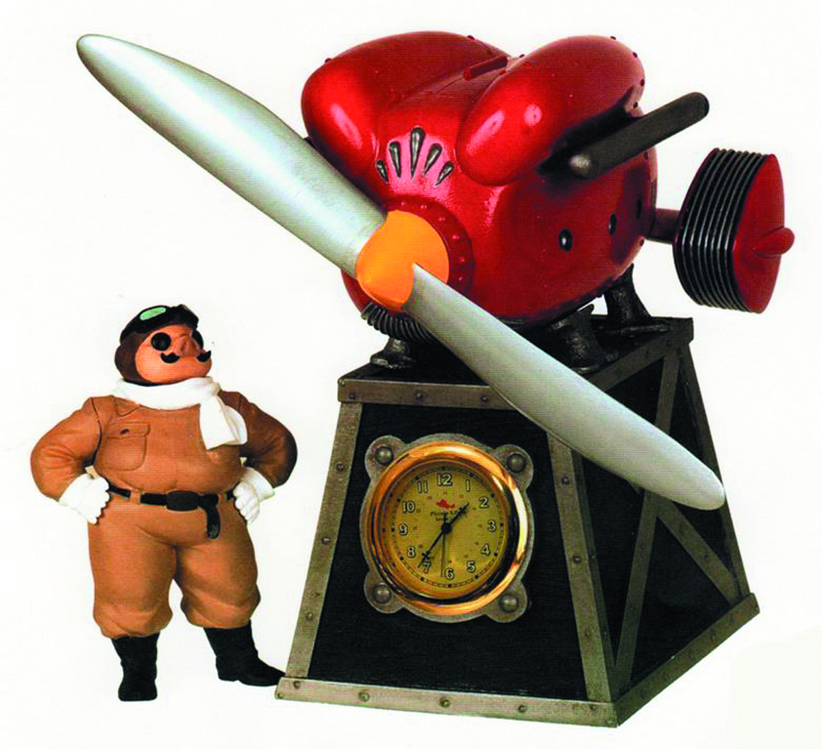 This charming table clock will take you soaring into the air with the characters of Porco Rosso. Marco Pagol, the titular Porco Rosso ("Crimson Pig") is a figurine that stands 3 3/8" tall, and his beloved airplane's engine and propeller is a clock that stands 8.5" tall.