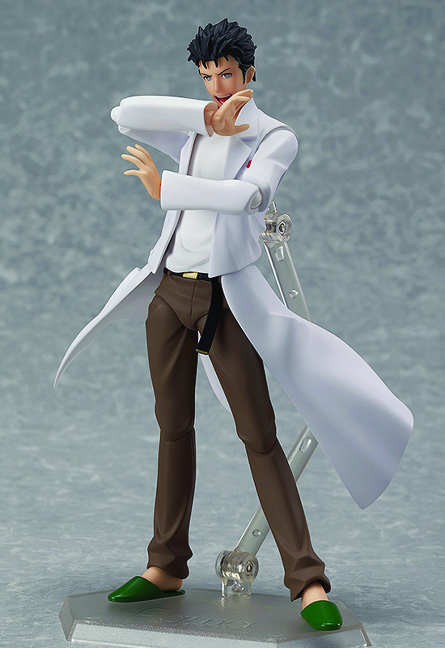 Rintarou Okabe! Using the smooth yet posable joints of figma, and the included articulated figma stand, you can act out a variety of different scenes. He comes with three expressions including his standard listless expression, a confident expression and a worried expression. Alternate parts to display him with hands in his pockets are included, as well as the Mirai Gadget #12: "Darling no Baka". The "Bit Particle Cannon" and Okabe's cellphone are both included, as well as optional leather boots.