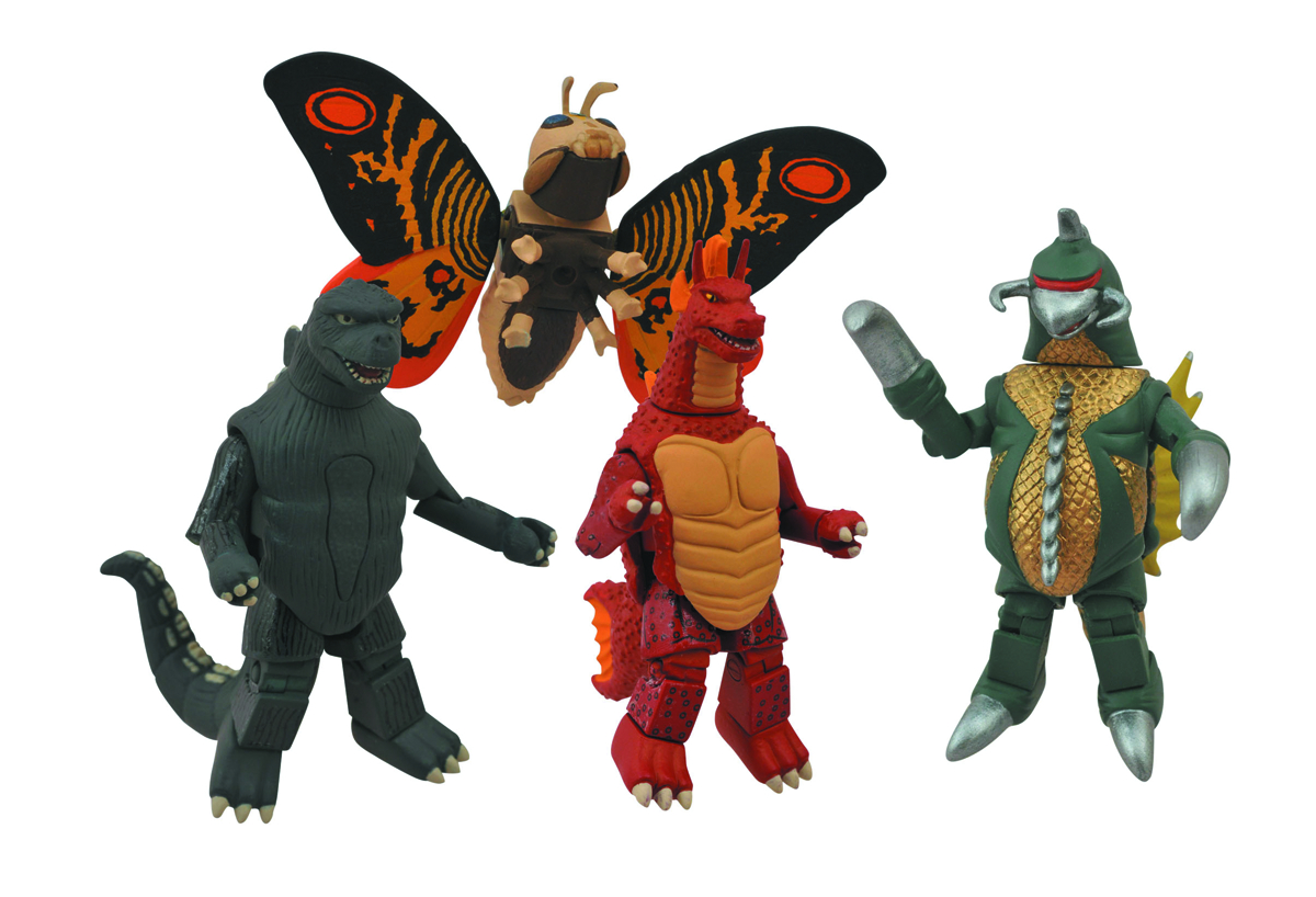 A Diamond Select Toys Release! What's the best way to stop a towering atomic monster? Put him in your pocket! Celebrating 60 years of Godzilla movies, this box set of classically-styled Minimates includes Godzilla and three of his most famous friends and foes: Mothra, Gigan and Titanosaurus! Each Minimate mini-figure stands approximately 2 inches tall and features a variety of interchangeable parts. Packaged on a blister card. Designed by Art Asylum!