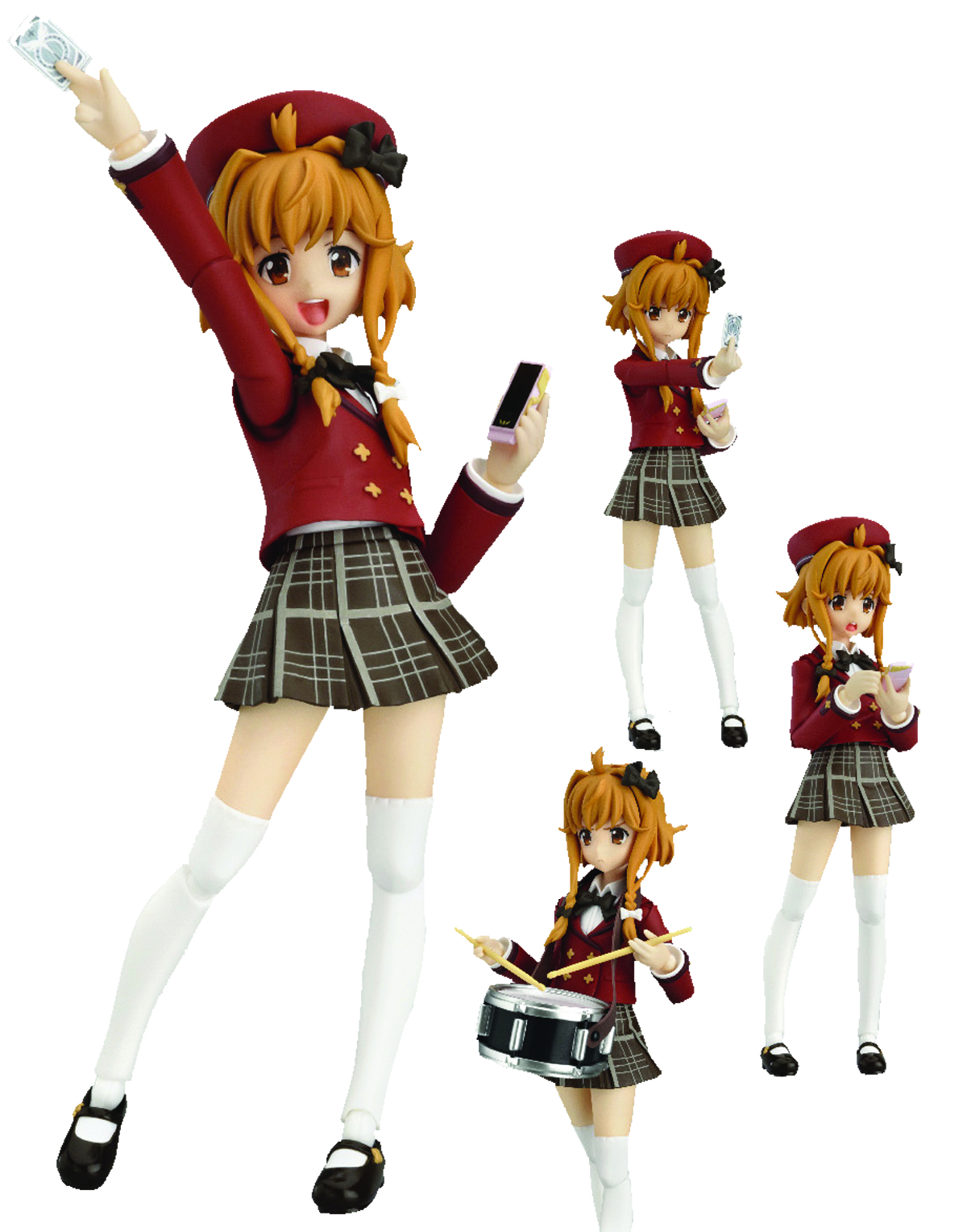 Uzume Uno! Using the smooth yet posable joints of figma, you can act out a variety of different scenes. A flexible plastic is used for important areas, allowing proportions to be kept without compromising poseability. She comes with a cheerful smiling face, a serious expression for battle as well as an unsure expression. Her beret and school bag are both included, as well as a card for battle scenes, and a drum with drumsticks to recreate your favorite scenes. An articulated figma stand is included, which allows various poses to be taken.