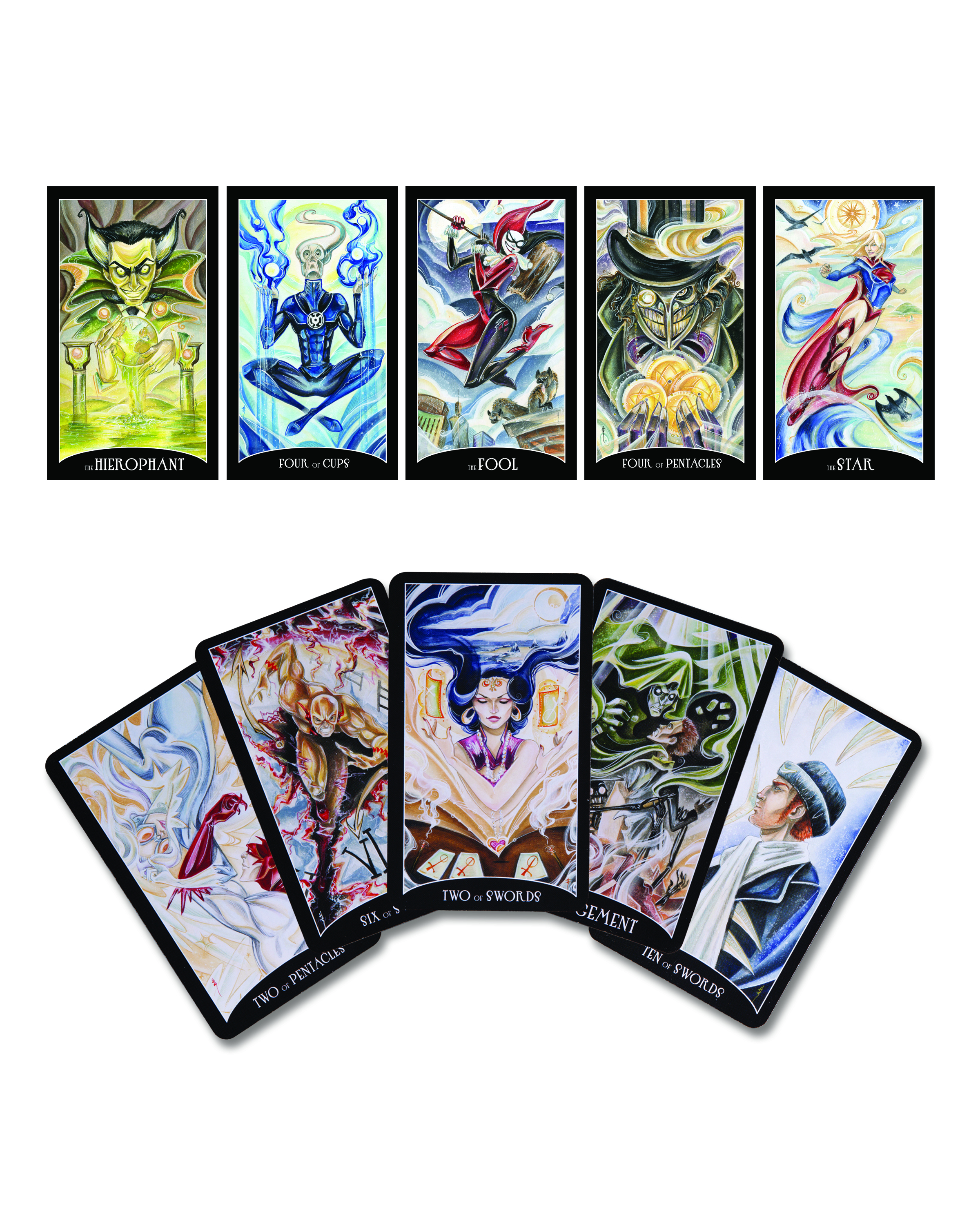 ARTWORK BY SARA RICHARD Reveal secrets and look into the future with this striking tarot card deck featuring stylized illustrations of the Justice League, which comes complete with a velvet bag.
