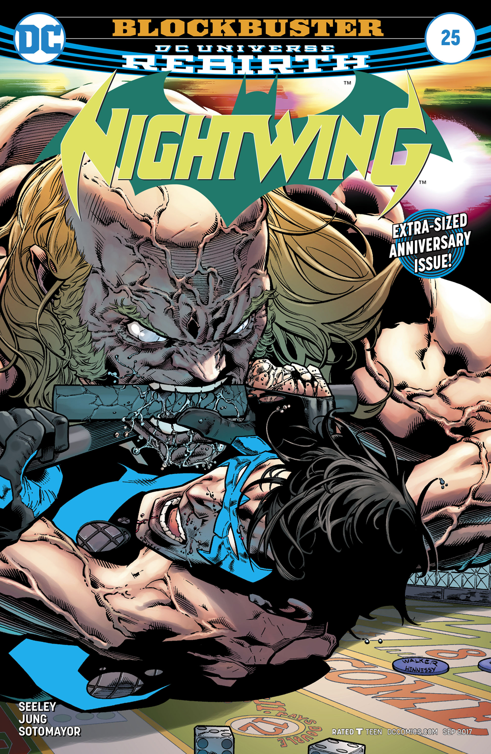 "BLOCKBUSTER" part four! In this special oversize issue, the boardwalk is the heart and soul of Blüdhaven, and Tiger Shark and Blockbuster are willing to kill each other and whoever else stands in their way to rule it. Nightwing has to find a way to stop them both or suffer a Blüdhaven ruled by crime!