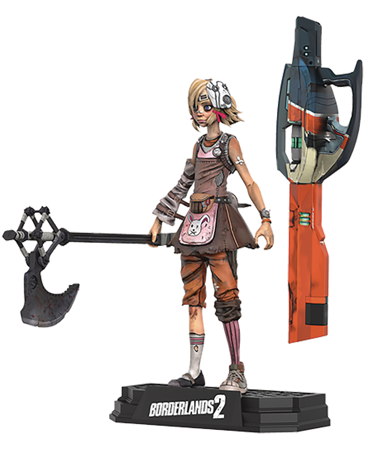 Borderlands 2. Designed with 12+ points of articulation for dynamic posing, Tina comes with giant battle axe and Maliwan rocket launcher. Figure features a stylized