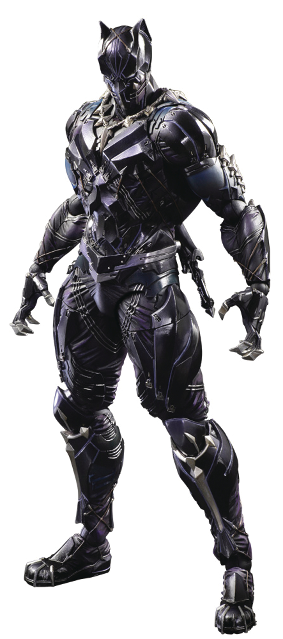 From Square Enix. Marvel's iconic Black Panther joins the Variant Play Arts Kai team from Enix! In a more armored-up version of his outfit, he stands a mighty 11" tall and is fully posable for maximum action! T'Challa comes with six extra interchangeable hands, two kunai-like bladed weapons, and a special base for display.