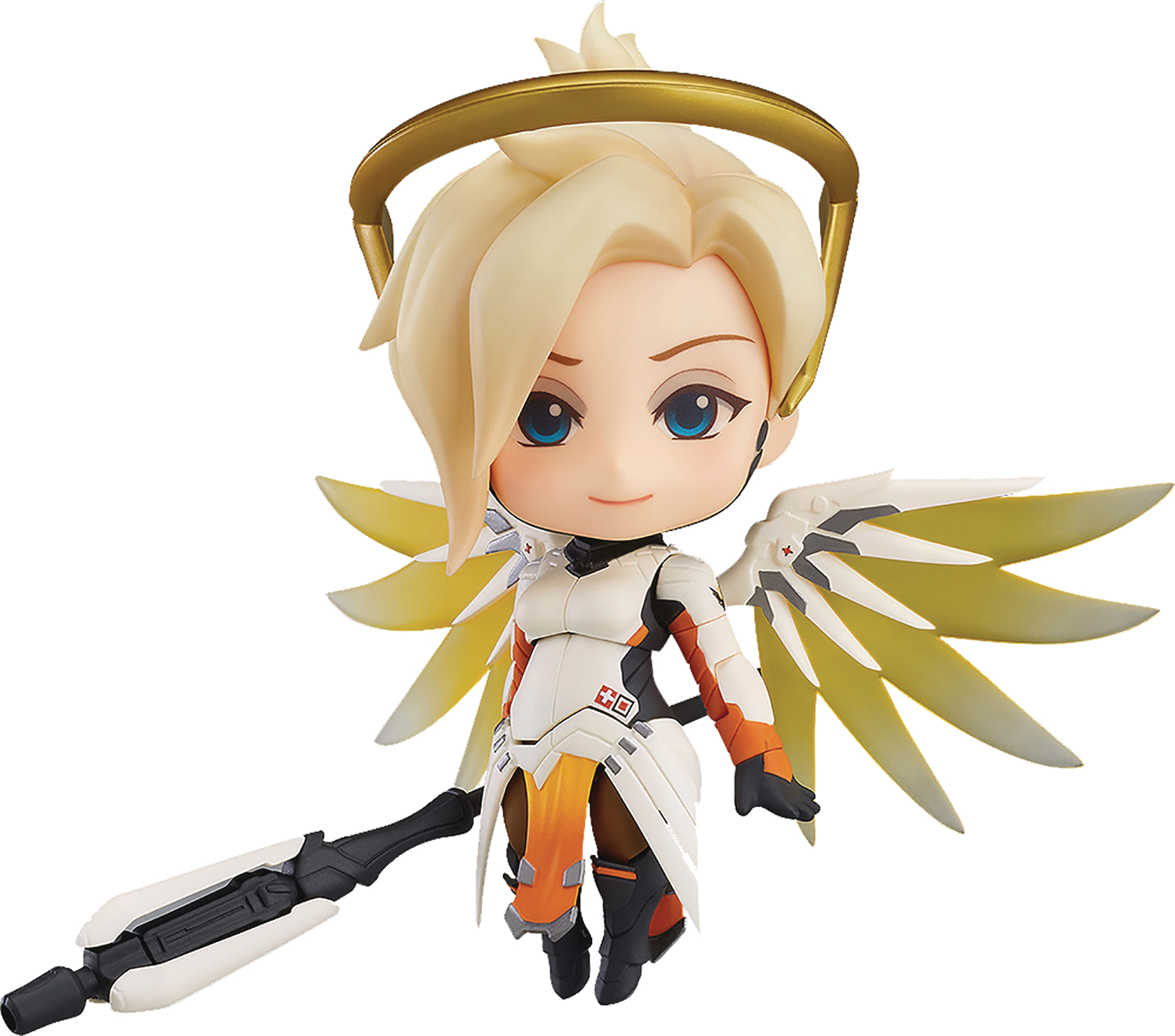 Mercy! She comes complete with two different face plates including a gentle smiling face as well as a tougher looking expression for combat scenes. The Nendoroid is fully articulated including movable wings, which allow for various poses ranging from dynamic action poses to more relaxed poses. The wings make use of translucent parts to faithfully capture Mercy's appearance in game, and the wings can also be removed to display her in poses similar to her emotes and victory poses from the game. Her staff comes with interchangeable parts allowing you to switch between the closed and opened tip, and effect parts are also included to display her healing other characters!