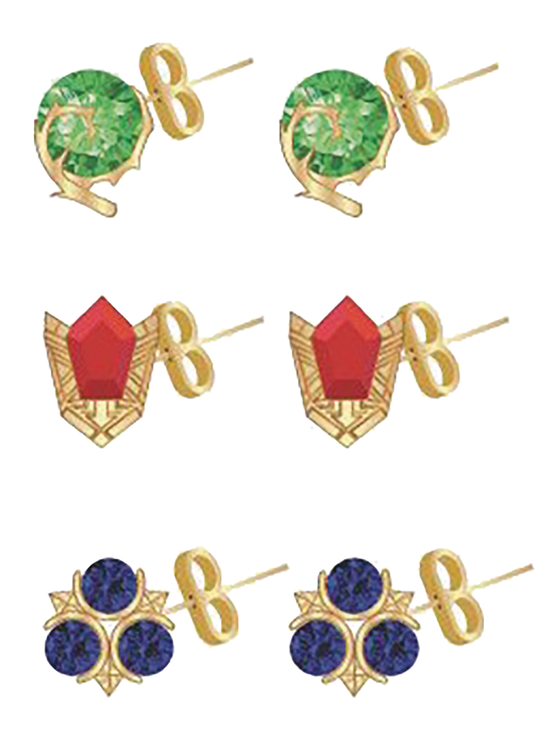 Open the Door of Time with this 3 pack of earrings with designs based on the Spiritual Stones: Kokiri's Emerald, Goron's Ruby, and Zora's Sapphire!