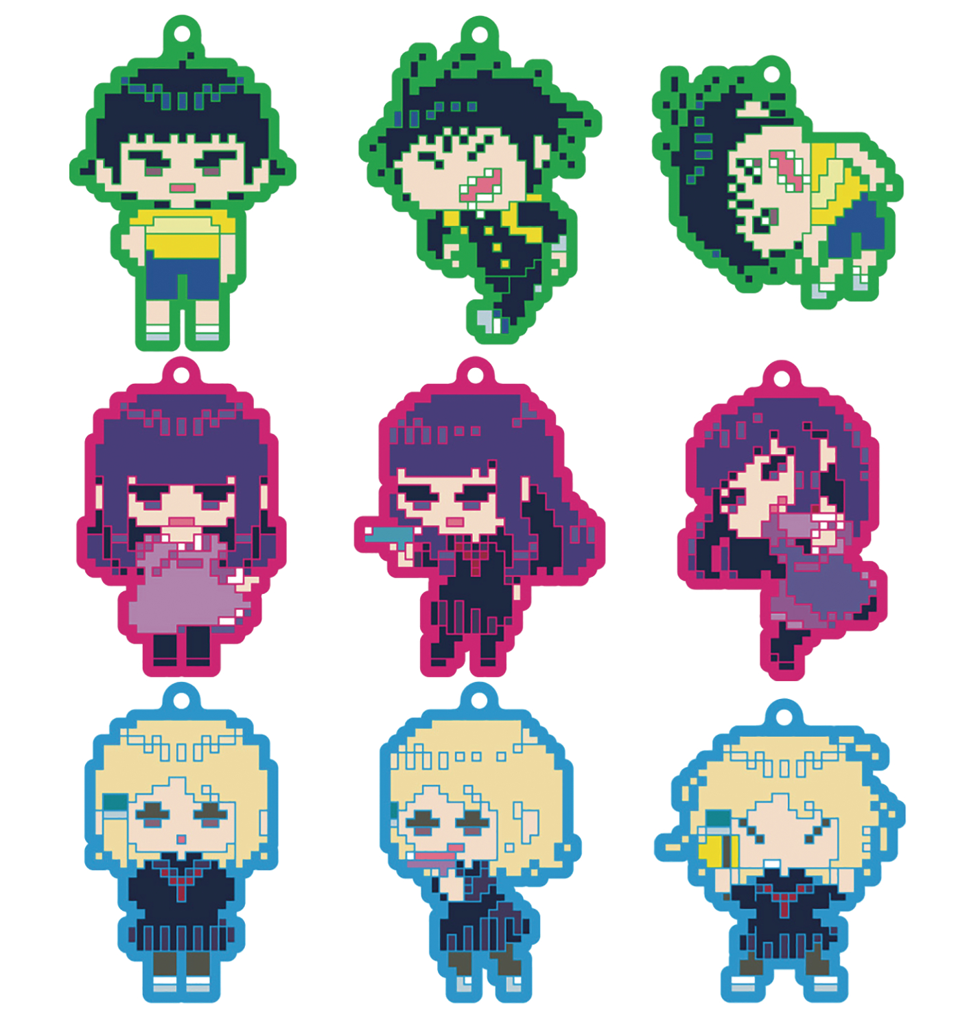 High Score Girl comes a set of collectible rubber straps featuring cute pixelated illustrations of the characters! The line-up includes three different versions of each of
