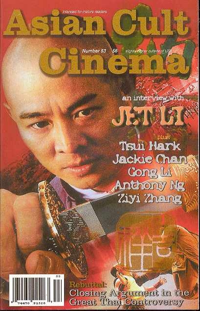 Asian Cult Cinema #53 features an extensive interview with Martial Arts superstar Jet Li, conducted by noted critic Sean Axmaker. This issue also includes a major interview with filmmaker Anthony Ng, director of the Sundance Award Winner motion picture
