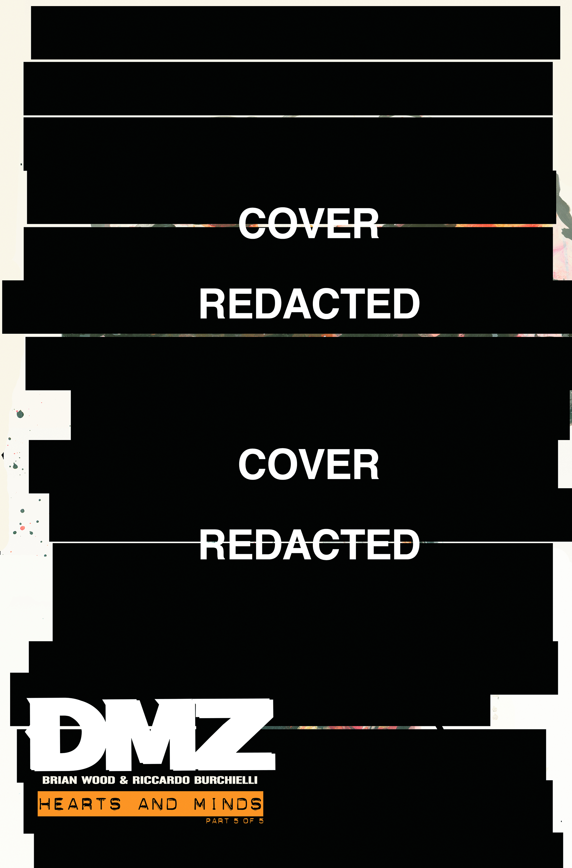 "Hearts and Minds" 5 of 5. The entire future of the DMZ pivots on this issue, with horrific events unfolding not only for Matty and those close to him, but the city that's taken him under its wing. It's an issue so monumental, we had to redact the cover in order to not spoil a single thing...