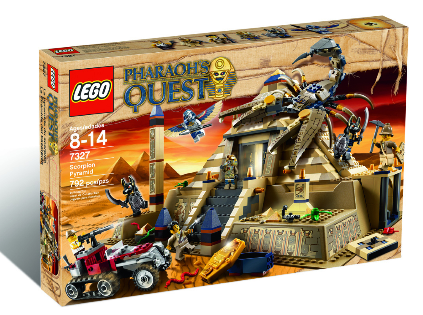 Scorpion Pyramid, the brave heroes go face-to-face with the evil mummy horde. If the mummies get the ultimate Golden Nemes, they will awaken the Pharaoh and he will rule the world. Can the heroes navigate the maze of sliding doors, booby-trapped stairs, and the Pharaoh's tomb in order to escape the clutches of the mummies? 792 pieces.