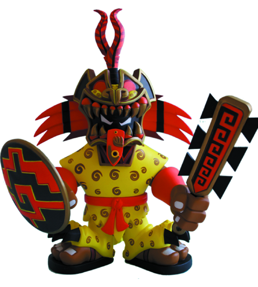 Jaguar Knight is Jesse Hernandez's latest masterpiece and he is a weapon-wielding warrior from ancient Aztec history. Towering over everyone elese at almost 12" tall, this dark and menacing knight is a well-respected and feared elite warrior. With his macuahuitl and shield, he is ready to hunt for his elusive ultra-evil chase. Comes with a Macuahuitl and shield and 7 points of articulation. This edition is limited to just 360 pieces with a chase version included.