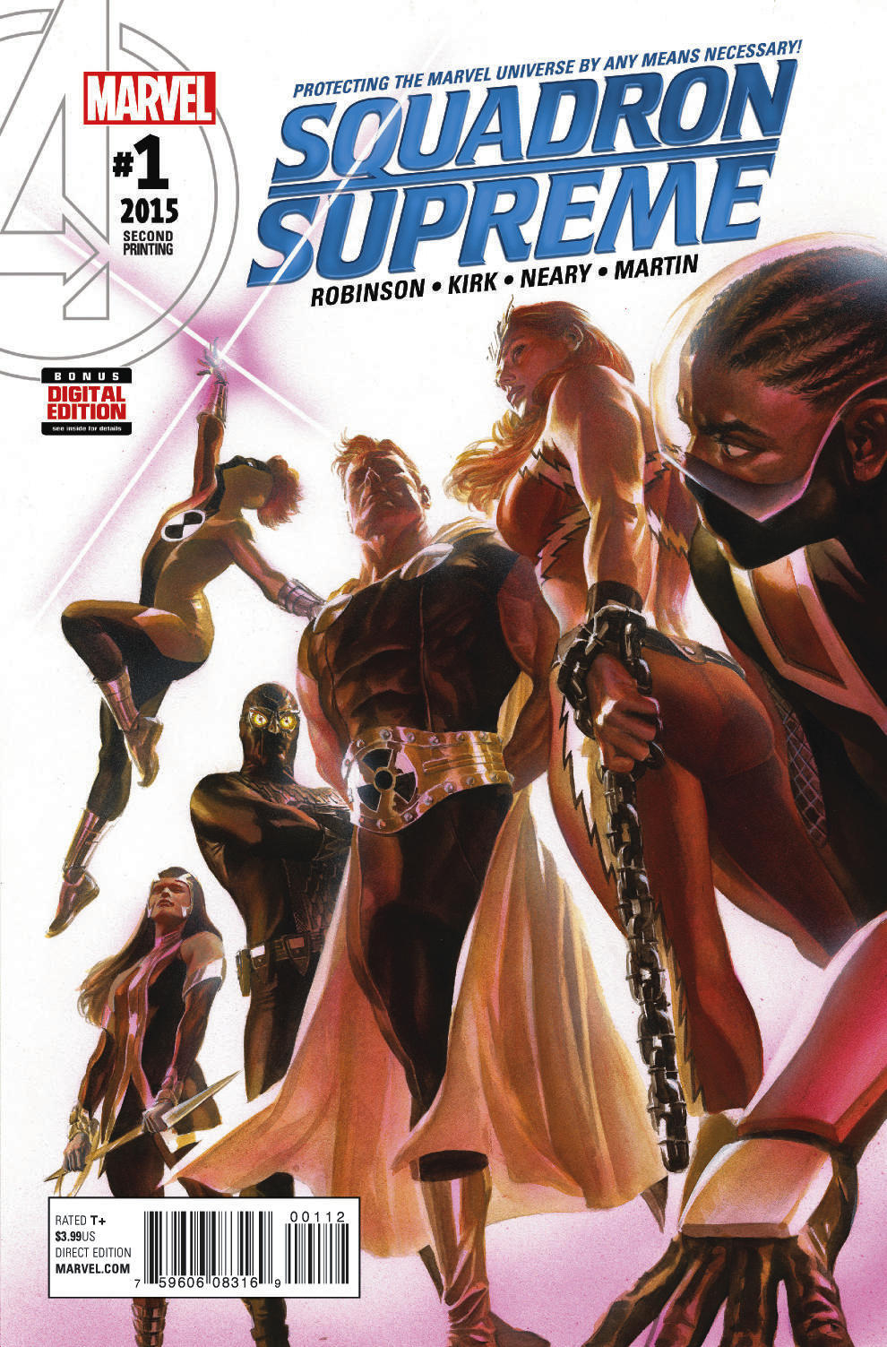 From Marvel Comics. They're each the sole survivor of a lost Earth and they'll do anything to protect this one, whether you like it or not. The Squadron Supreme -- comprising Hyperion (Avengers), Nighthawk (Supreme Power), Dr. Spectrum (the Great Society), Blur (DP7) and Power Princess -- are a team that doesn't ask permission or what the rules are. To them all that matters is the safety of Earth and if you stand in the way ... that's your problem! Tell that to the Squadron's first target -- Namor, destroyer of Dr. Spectrum's homeworld, who will have to pay for his crimes ... but at what cost to the people of Atlantis. Rated T+. Scheduled to ship 02/03/16. (161)