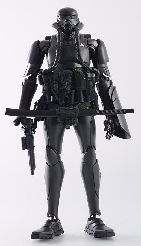 From ThreeA. When The Tk vanish for the second time, they are all that stands between us and nature mortis! This unique 1/6-scale Black Sun Commando Trooper from ThreeA stands approximately 13" tall and boasts 28 points of articulation. The iconic stormtrooper look is combined with the Tomorrow Kings asthetic in satin black to create a truly intersting collectable piece for art toy and Star Wars fans alike. This Black Sun Commando Trooper comes with 3 pairs of interchangeable hands and acessories like grenades, swords, a SHOWA shotgun, 5 sets of untility pouches.