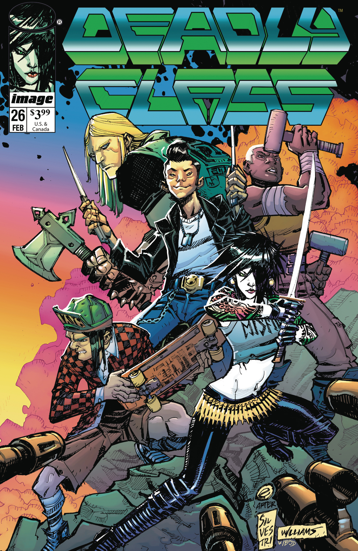 Rick Remender and Wes Craig's DEADLY CLASS #26 CVR B HOMAGE CVR features cover art by Eric Canete, colors by Jordan Boyd, in homage to the fan-favorite Top Cow series CYBERFORCE created by Marc Silvestrwith a cover that commemorates Marc Silvestri's CYBERFORCE #1.