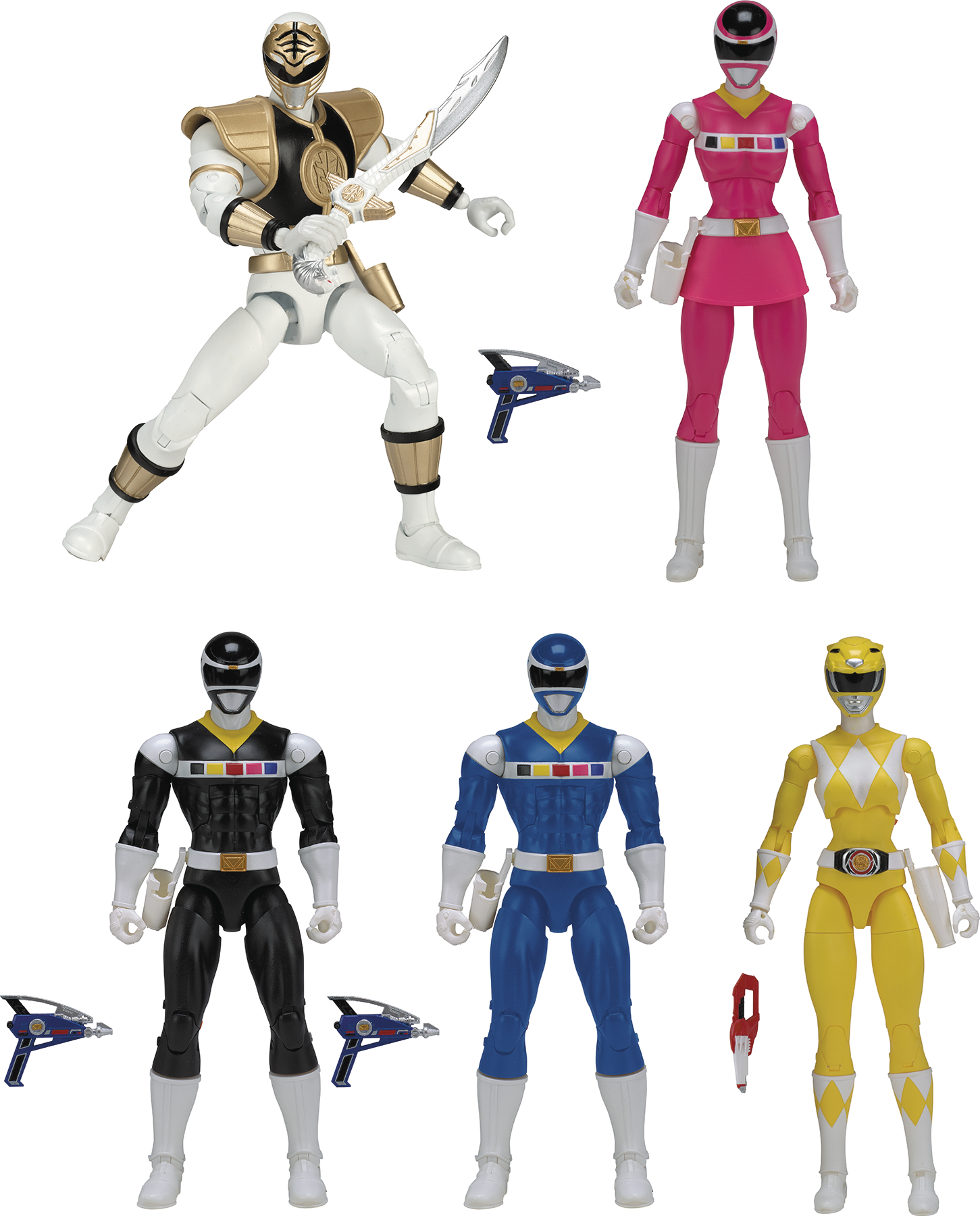 Mighty Morphin Power Rangers with these 6" tall Legacy figures, which feature multiple points of articulation and collectible Legacy packaging-based on the original Mighty Morphin' figures released by Bandai America in 1993! Each figure includes one battle gear item. Figures include MMPR Yellow Ranger, MMPR White Ranger, Space Black Ranger, Space Blue Ranger, and Space Pink Ranger.