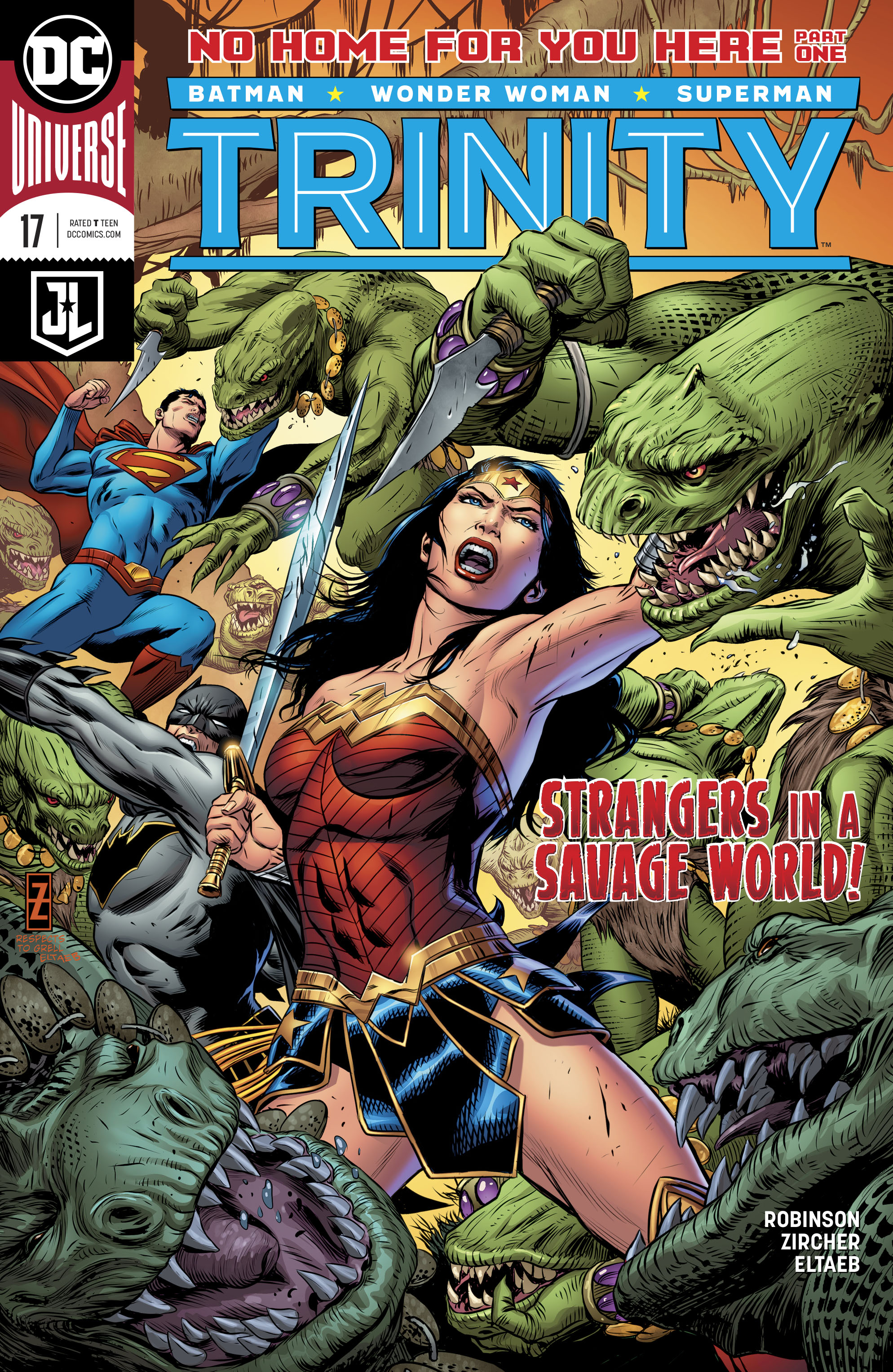 "No Home for you Here" part one! Batman and Superman embarked on a quest to help Wonder Woman rediscover Themyscira, but finding Diana's lost homeland proves more difficult than these three heroes expected. While on their journey, a distress call from a nearby ship turns out to be more than meets the eye, and the Trinity find themselves marooned on the dread island of Skartaris. To make their way back home, our heroes will have to overcome Deimos, who will stop at nothing to seal off Skartaris from the rest of world forever!