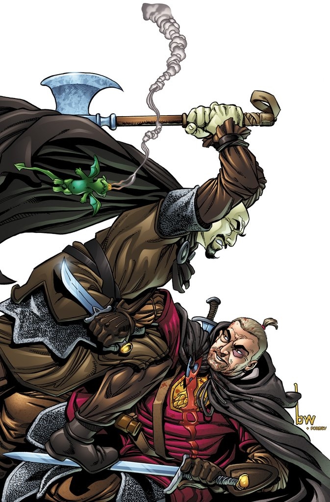 Wrapping up the first LARK'S KILLER storyline, the assassin Hala is flat on her back and at Lark's mercy - but it remains to be seen if Lark has any mercy to give. After all, all we really know about the street rat so far is that she's a thief and a runaway. Who knows? Maybe she'll surprise us. In the meantime, Brenar concludes his duel to the death with Jolly Boy, quickly coming to the same conclusion Jolly Boy had, which is Brenar's no match for him. All this, and a return of the drunken wizard. Isn't that exciting?