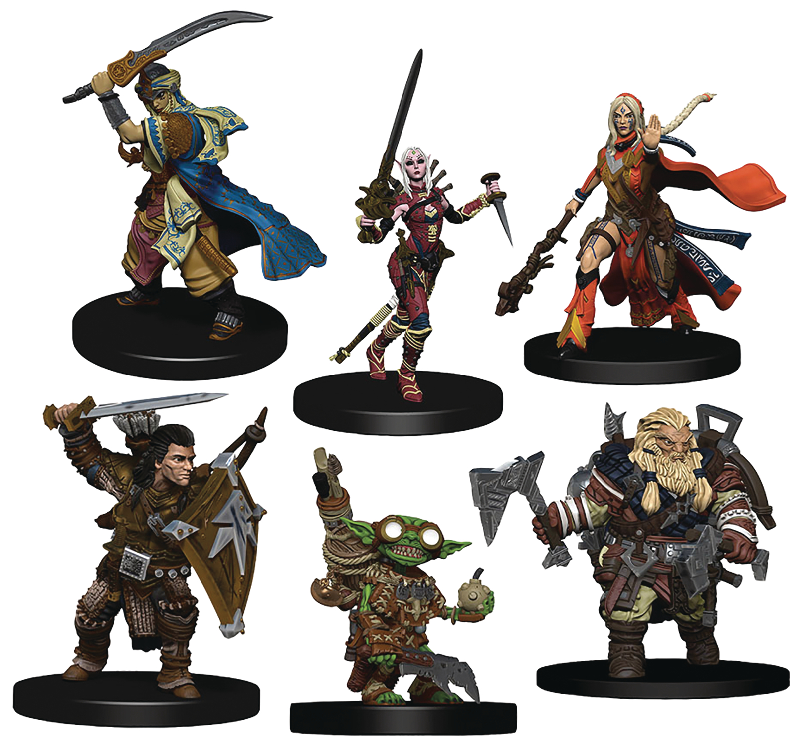 Pathfinder Battles: Iconic Heroes Evolved includes 6 all-new miniatures featuring famous personalities from the Pathfinder Playtest! Valeros, Human Fighter; Harsk, Dwarf Ranger; Seoni, Human Sorcerer; Fumbus, Goblin Alchemist; Mersiel, Elf Rogue; and Kyra, Human Cleric. Each of these miniatures is an all-new sculpt and will feature a dynamic pose, incredible detail, and a premium paint job.