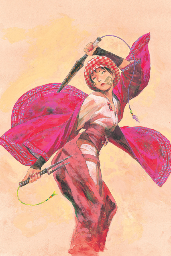 It's almost funny, how D a, the Itt -ry  sparkplug, so brashly hurls herself into trouble. She's in some serious danger now, though, and Edo's angry police force has her and her friends cornered and outnumbered. With dexterous D a swinging her daggers and Isaku showing off his heavy-handed fighting style, Rin is aghast, caught up in a senseless battle. Meanwhile, deranged Doc Burando stews in a jail cell, having failed his master too many times. However, that doesn't mean that his twisted mind will stop thinking about Manji and the mysterious kessen-chu bloodworms that grant immortality to their hosts. This issue also features Stan Shaw's final back cover "Seasons" illustration, which links up to issues 117 through 119 to complete a gorgeous color quadtych image!