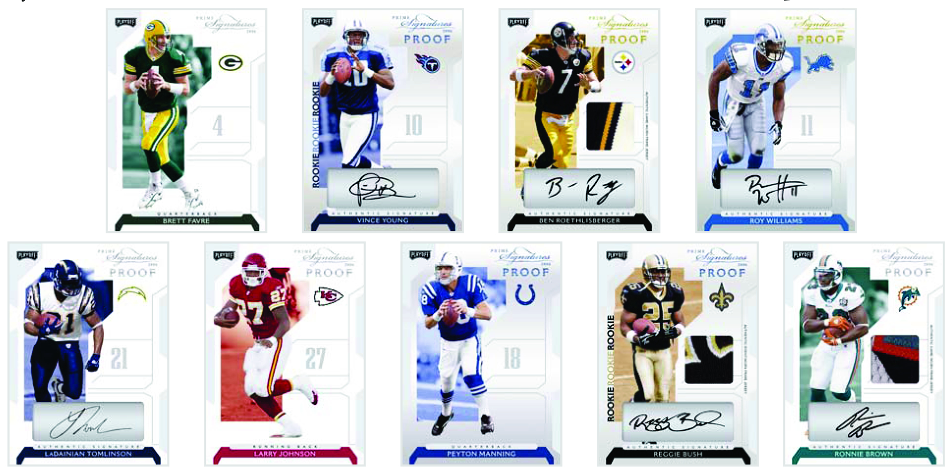 Playoff Prime Signature Football will ship with the complete 150-card set - including 70 veterans and 80 Rookies - all packaged in a metal tin! Also, each tin will include 3 special insert cards: 1 base parallel, 1 rookie parallel and 1 Autographed or Autographed "Prime Swatch" parallel card. Also look for "Proof Parallels" (numbered to 250, 100, or 1/1), "Signature Proof Parallels" (numbered to 150, 50, or 1/1), or "Signature Proof Materials Parallels" (numbered to 100, 50, or 1/1) randomly inserted in set tins!